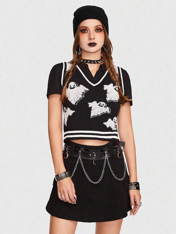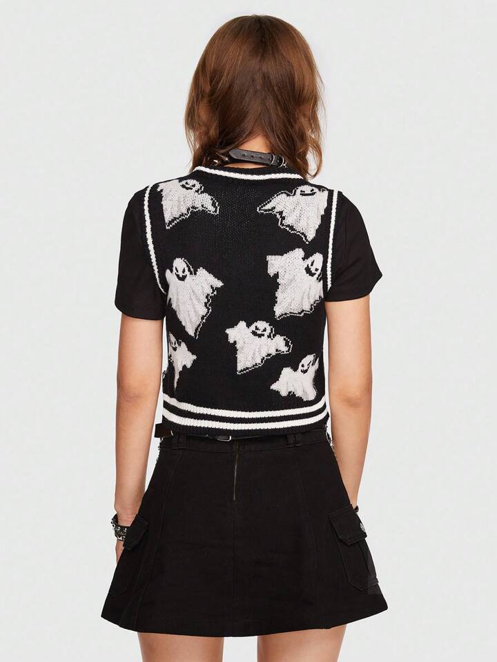 Goth Ghost Pattern Striped Trim Crop Sweater Vest