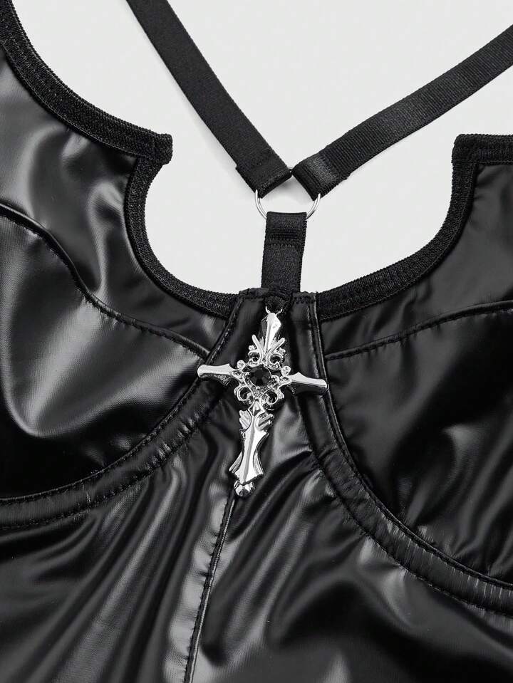 Gothic Black Bat & Cross Embellished PU Brassiere With Steel Rings