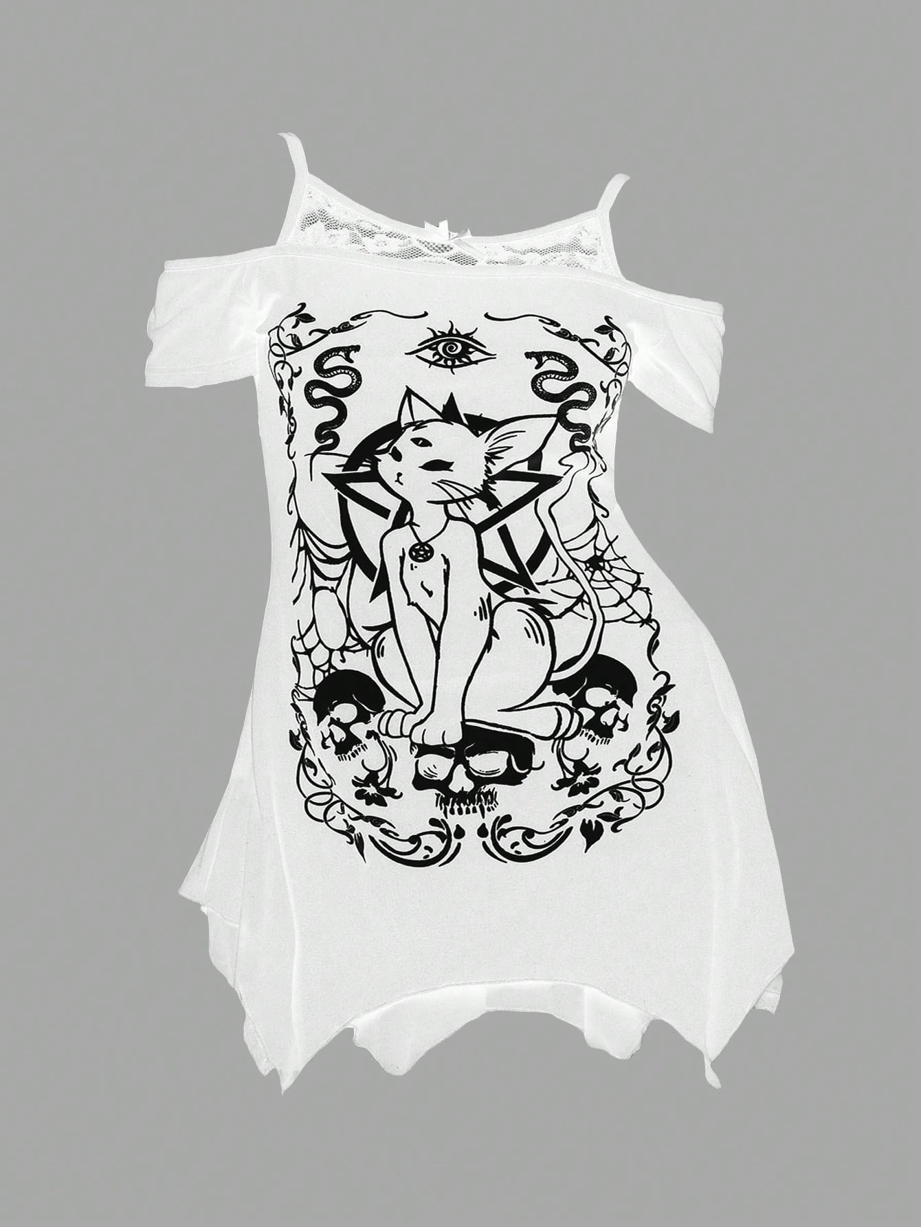 Gothic Cat Star Skeleton Print Asymmetrical Hem Off Shoulder Lace Cami Plus Size T-Shirt, Rave, Festival Streetwear, Halloween