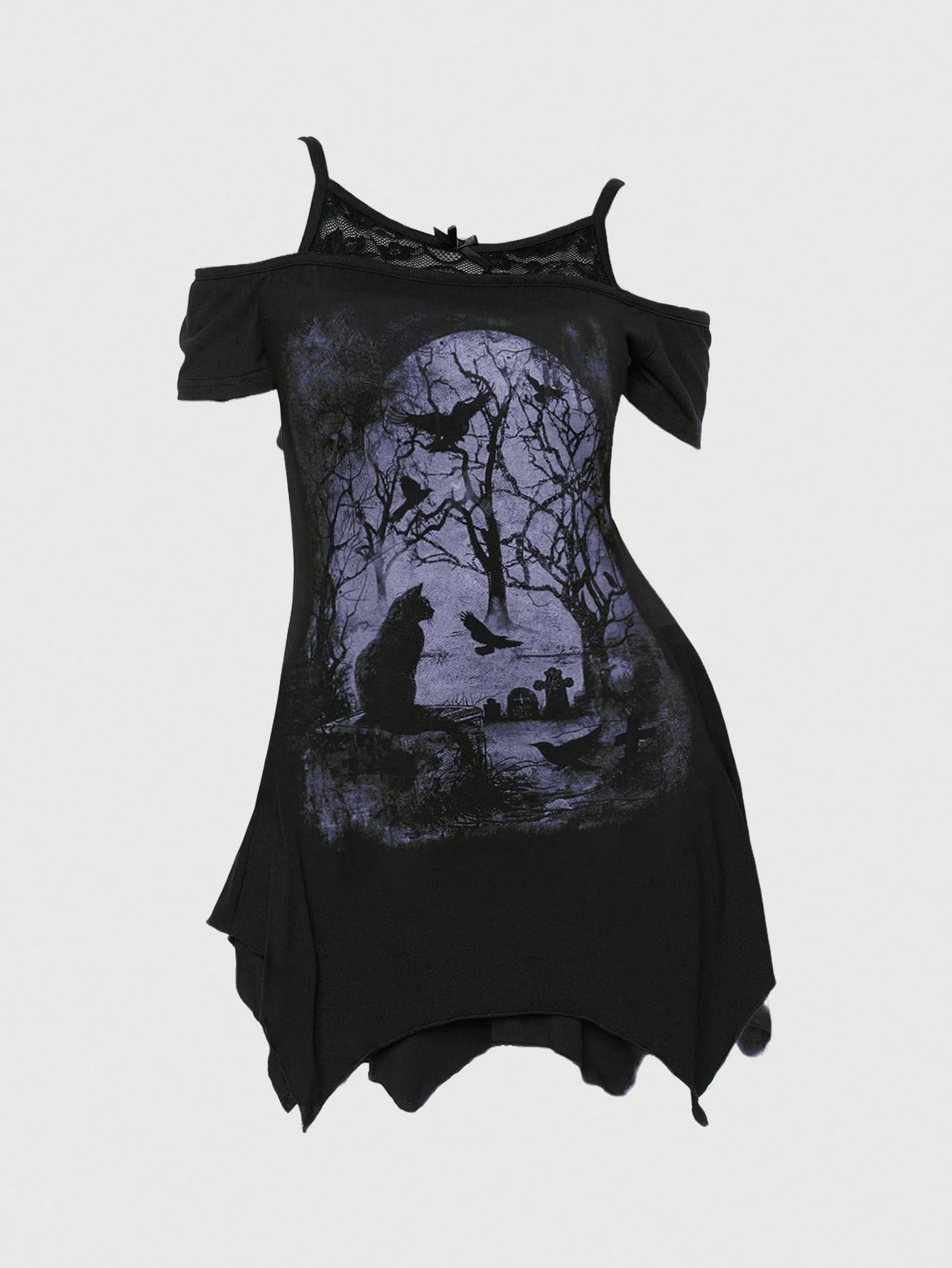 Gothic Dark Forest Crow & Dead Tree Pattern Off Shoulder Strap Asymmetrical Hem Lace Patchwork Black Gothic Vine Short Sleeve Open Shoulder Women T-Shirt