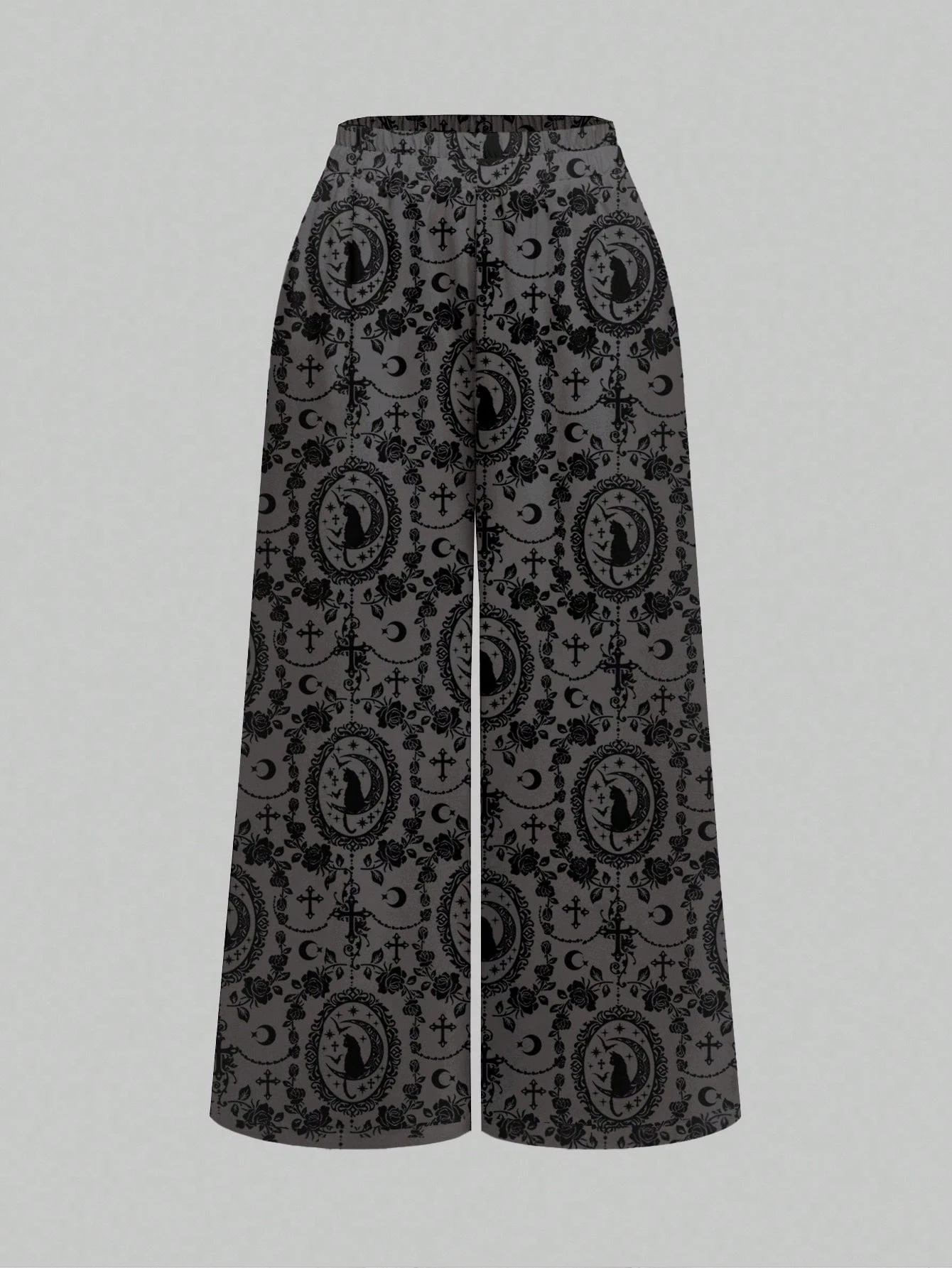 Gothic Dark Mysterious Horror Cross Vine Black Cat Halloween Rose Sexy Valentine's Day All-Over Print Wide Leg Pants For Women