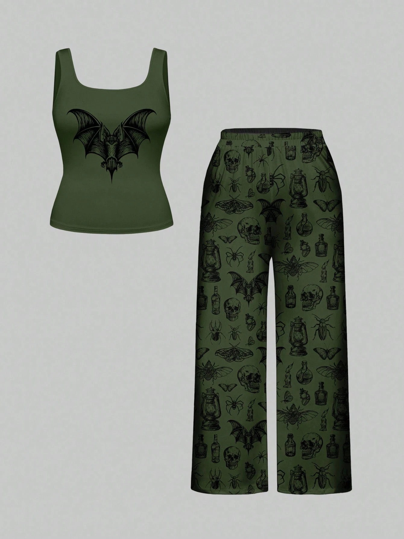 Gothic Insect, Bat, Poison Print Plus Size Sleeveless Top And Pants Pajama Set, Casual Loungewear