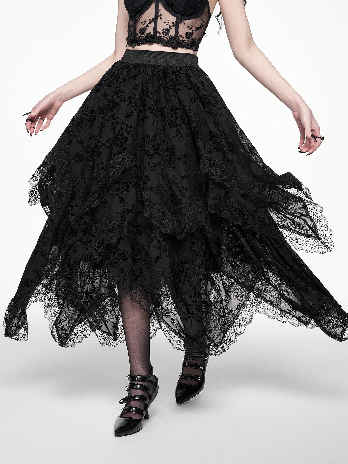 Gothic Romantic Elegant Palace Floral Vine Flocked Patchwork Asymmetrical Hem Lace Trim Skirt