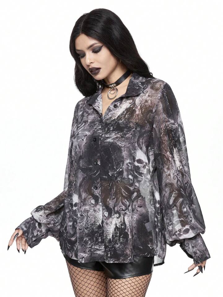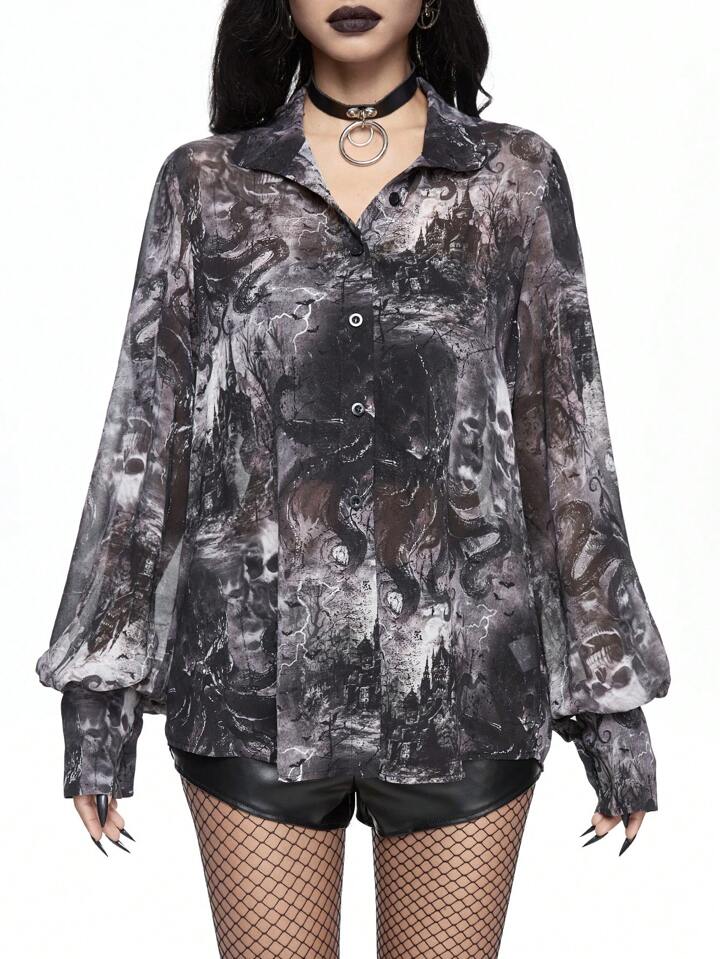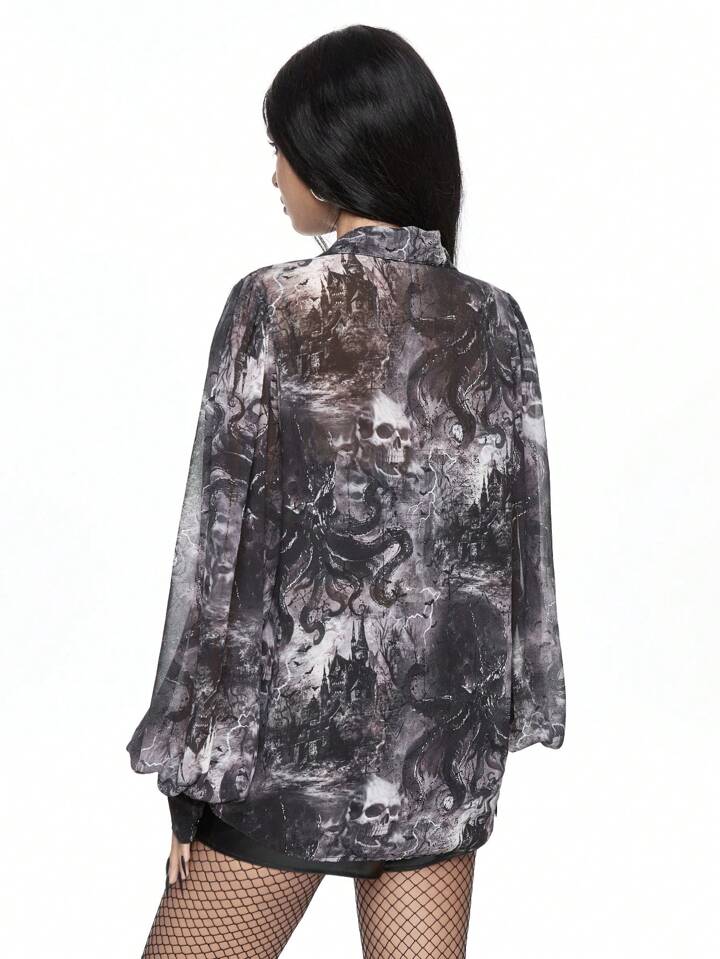 Gothic Skull Castle Print See-Through Chiffon Women Lantern Sleeve Shirt