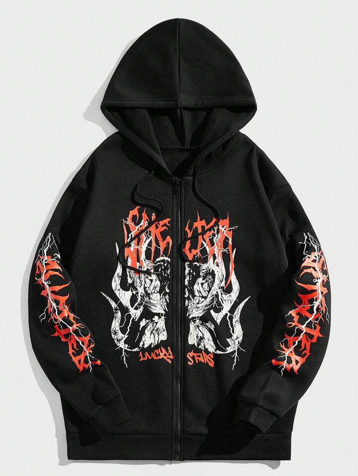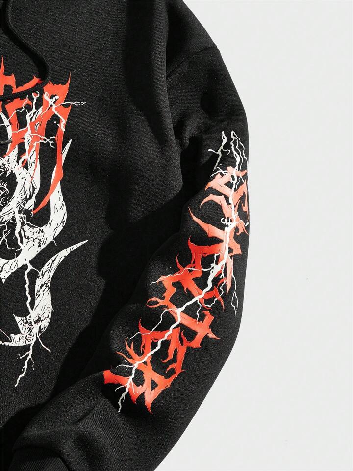 Goth Guys Letter & Figure Print Drawstring Hoodie