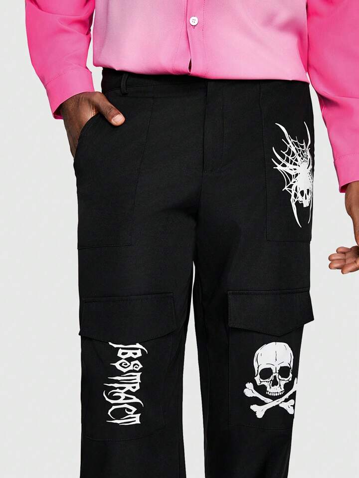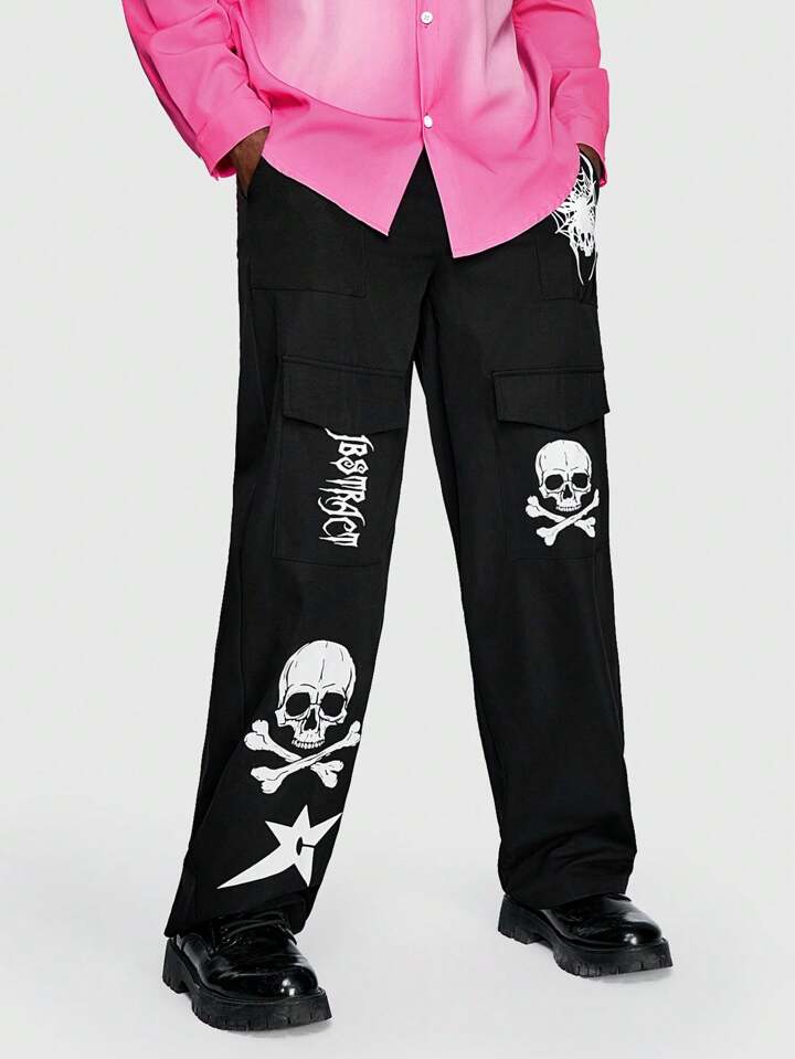 Goth Guys Skull & Letter Graphic Flap Pocket Pants