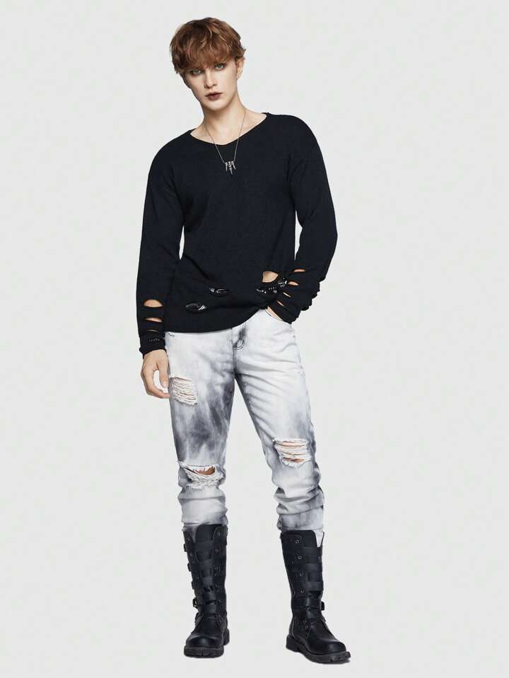 Goth Guys Solid Ripped Drop Shoulder Sweater