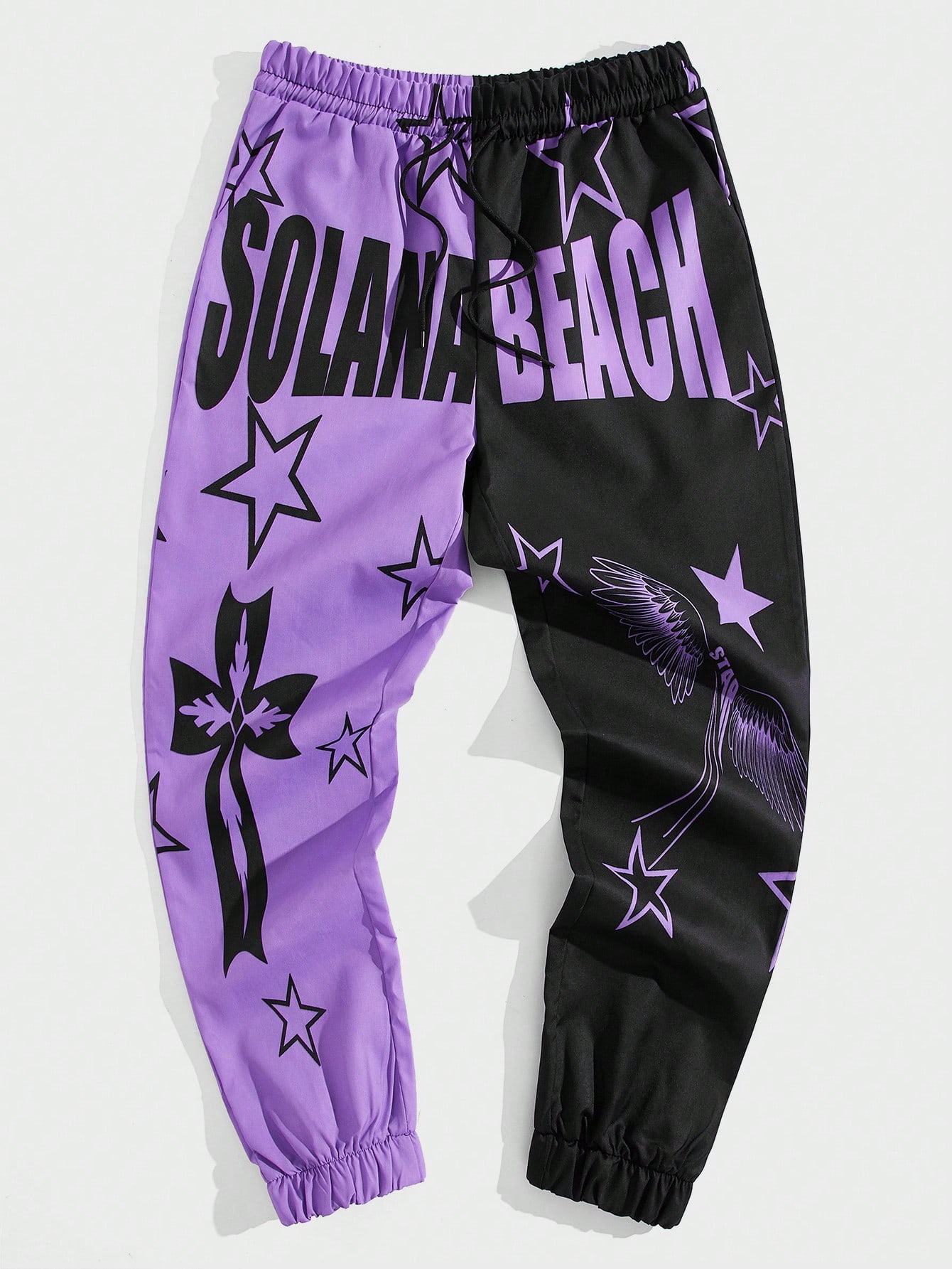 Goth Guys Star & Letter Graphic Two Tone Drawstring Waist Pants