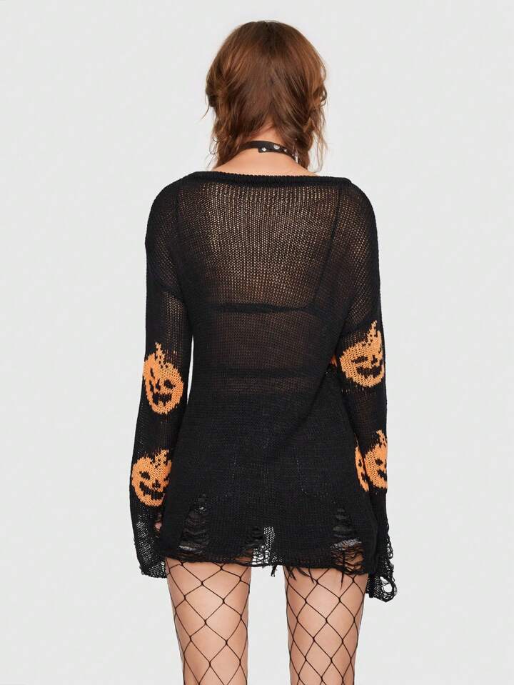 Goth Halloween Pumpkin Pattern Distressed Sweater