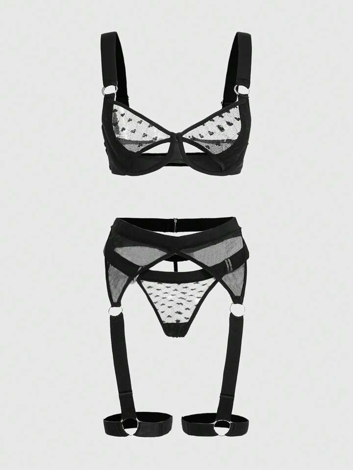 Goth Heart Pattern Mesh Underwire Garter Lingerie Set