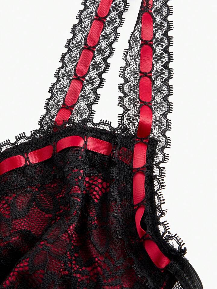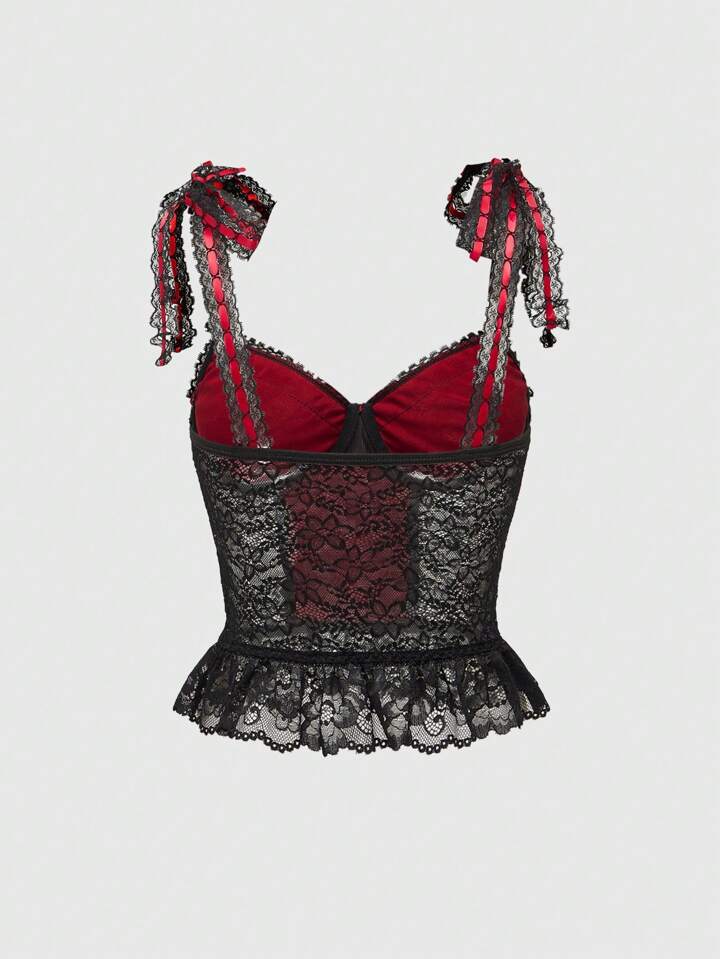 Goth Lace Red Inner Lining Silk Ribbon & Flower Design Waist-Cinching Camisole