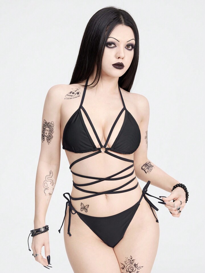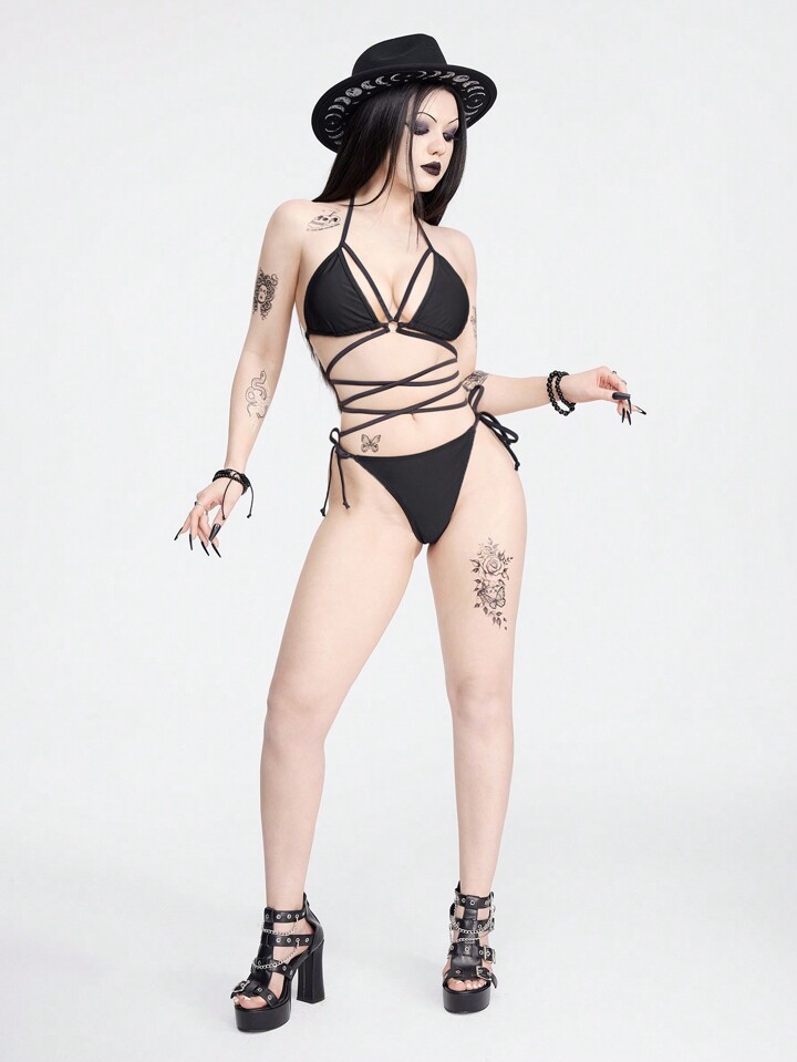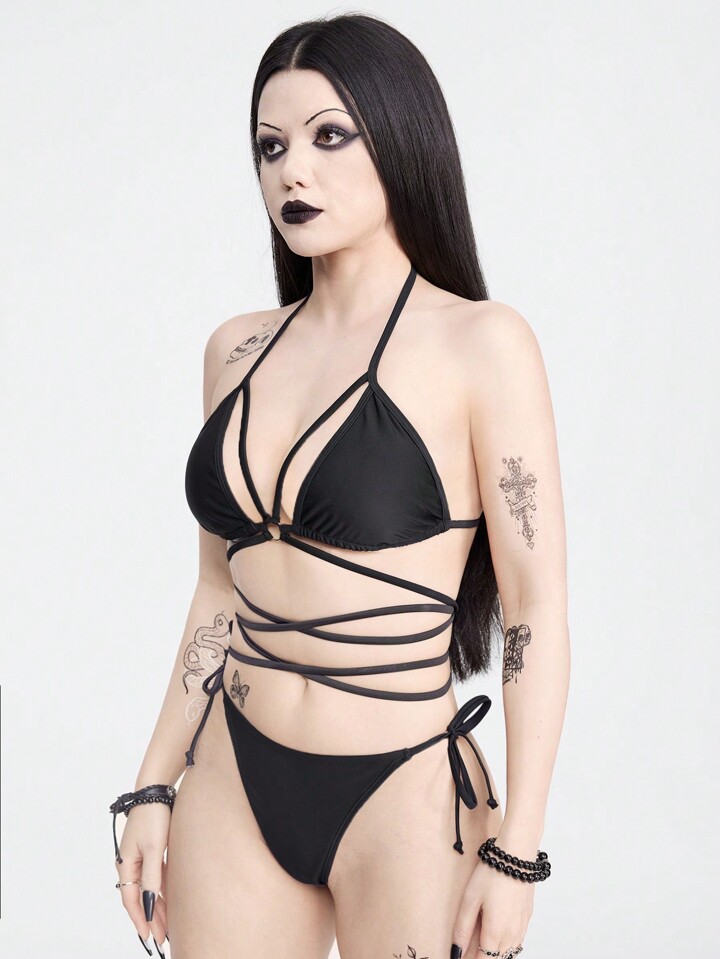 Goth Ladies Solid Color Bikini Set For Swimming Pool Vacation,Summer Beach