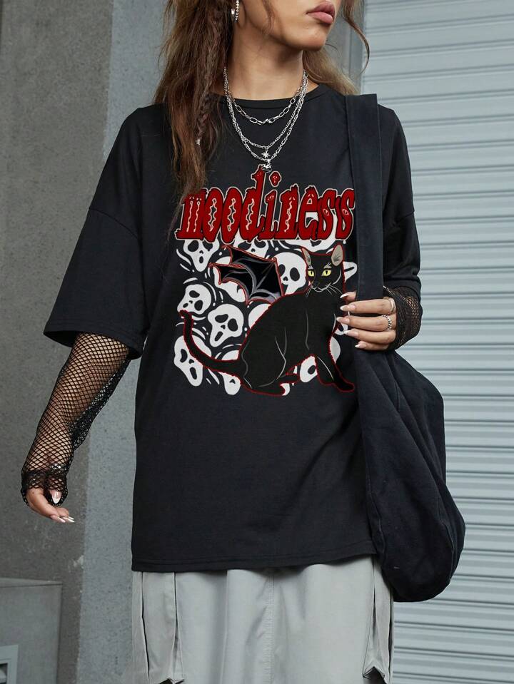 Goth Letter & Skull Graphic Drop Shoulder Tee