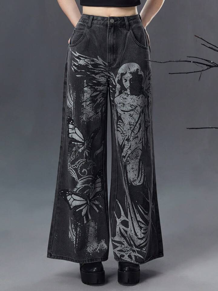 Goth Loose Retro Style Character Pattern Wide Leg Denim Jeans With Slant Pockets
