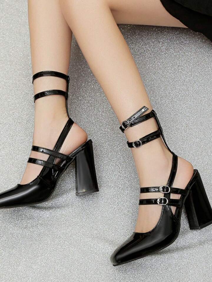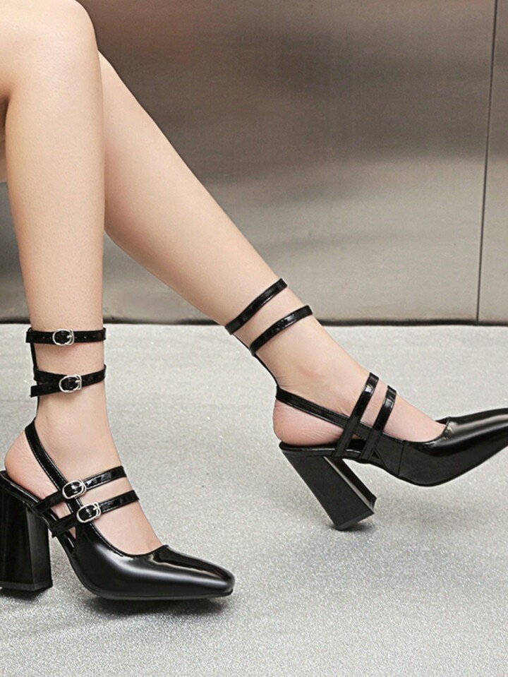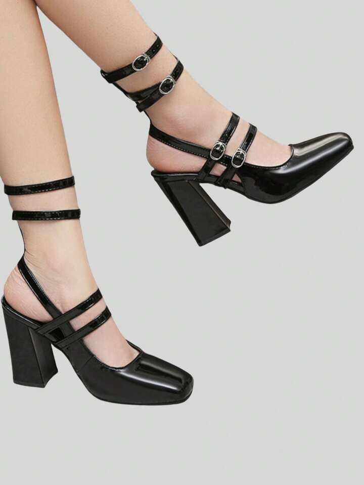 Goth Mary Jane Style Women's Chunky Heel Shoes, Retro Black Leather Shoes, High-Heeled Shoes