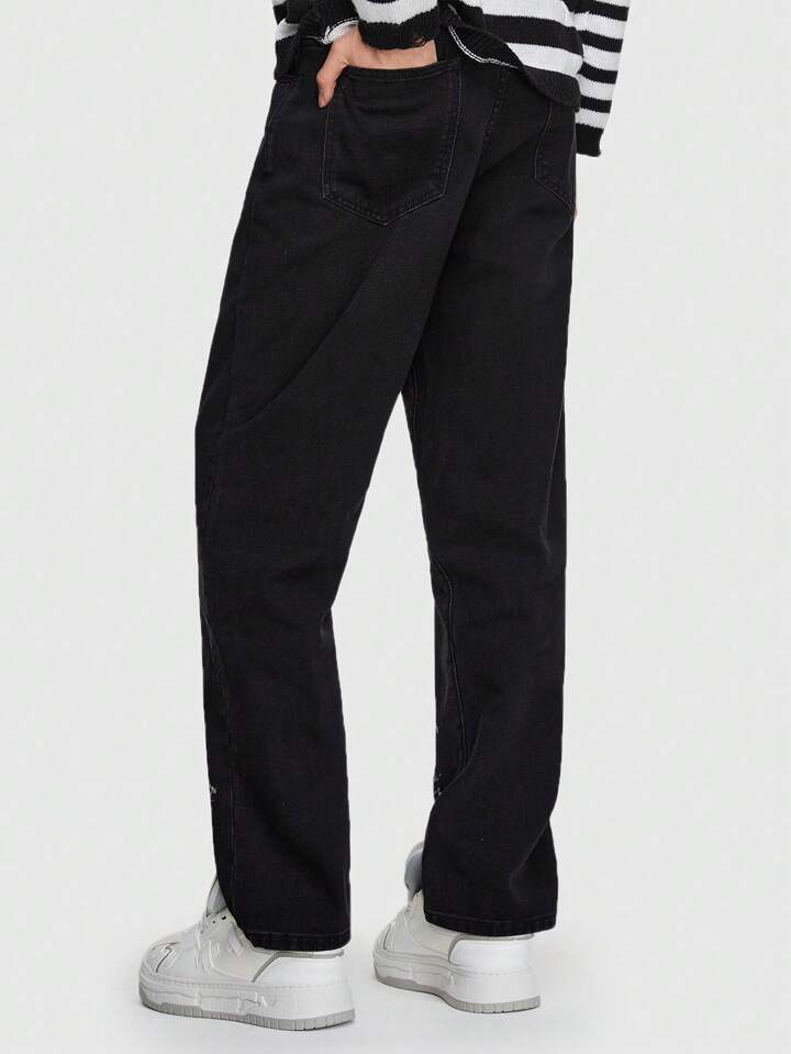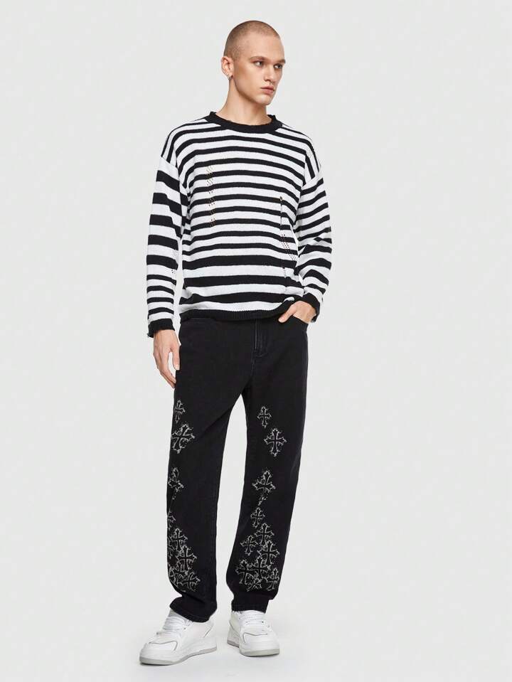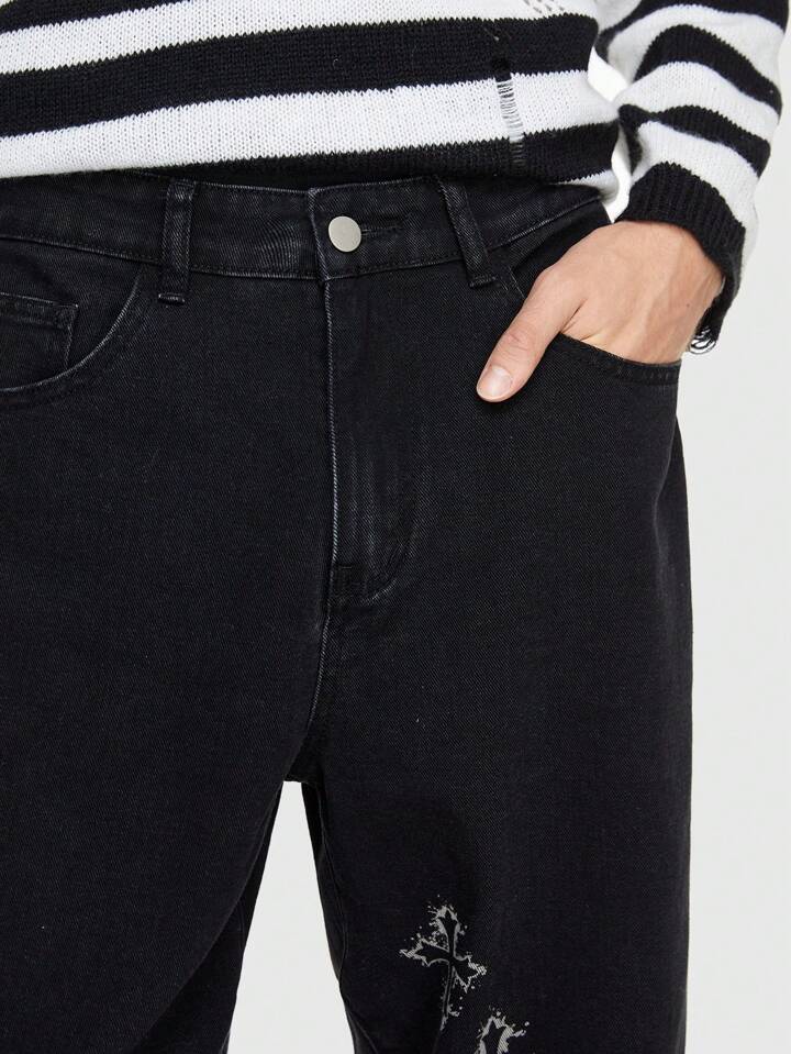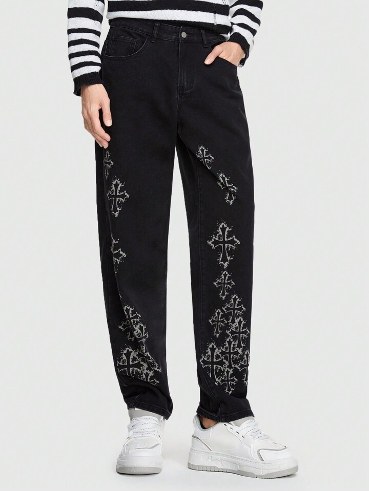 Goth Men Cross Print Straight Leg Jeans