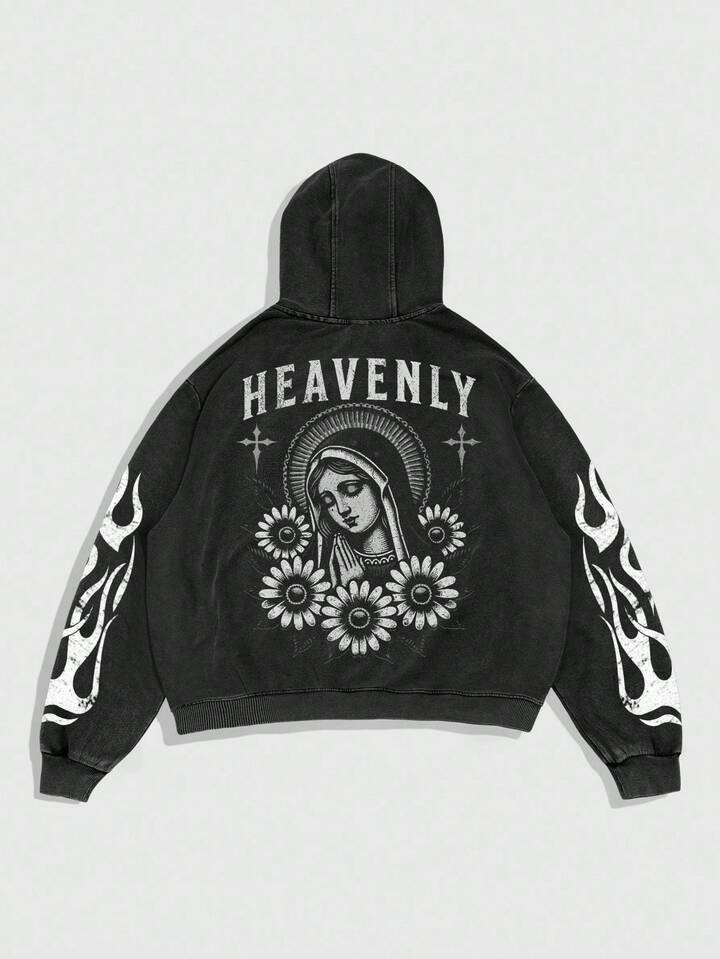 Goth Men's Autumn Letter & Floral Virgin Mary Print Zip-Up Drawstring Hooded Sweatshirt