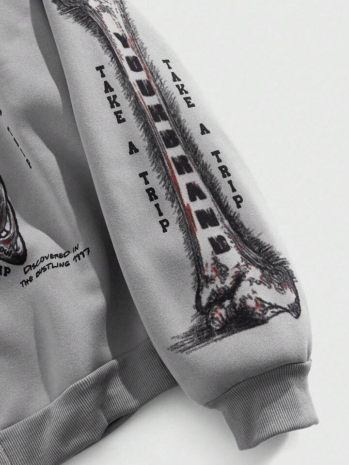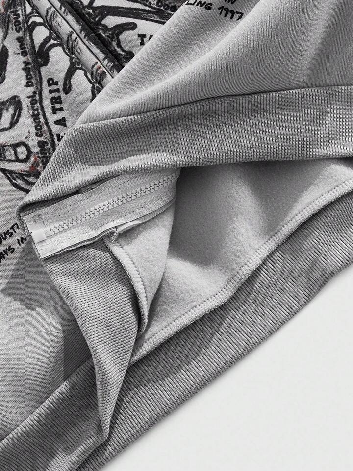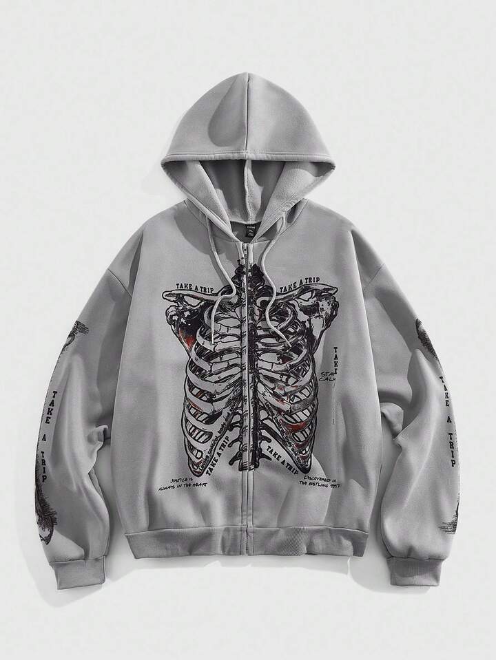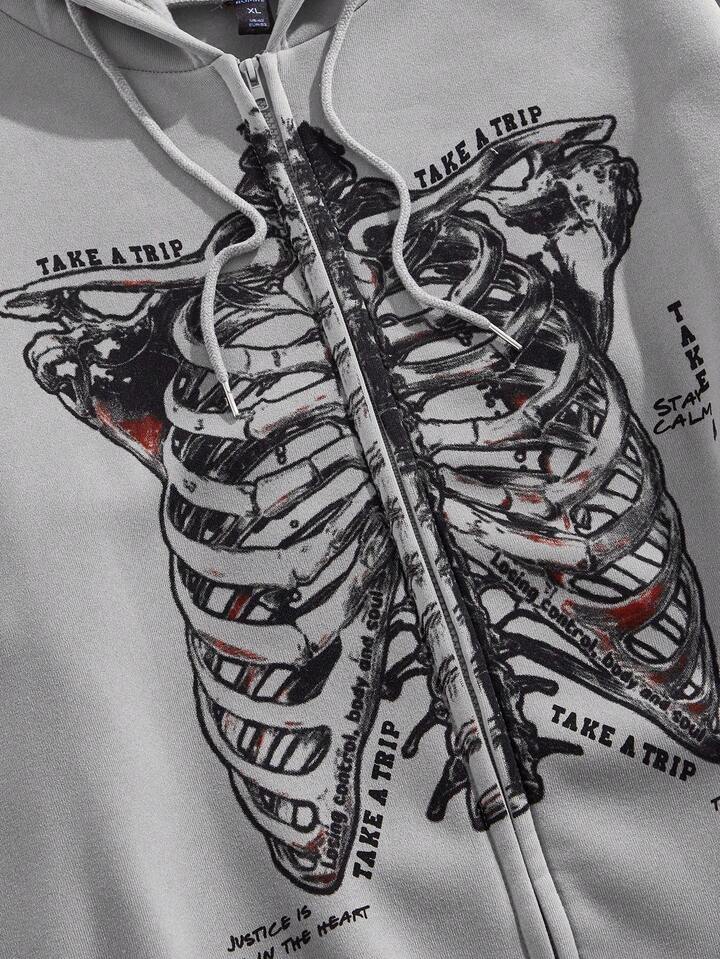 Goth Men's Autumn Street Skeleton Letter Print Zip-Up Drawstring Hoodie Sweatshirt
