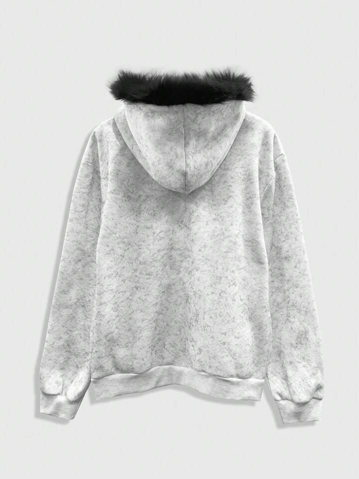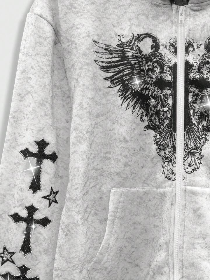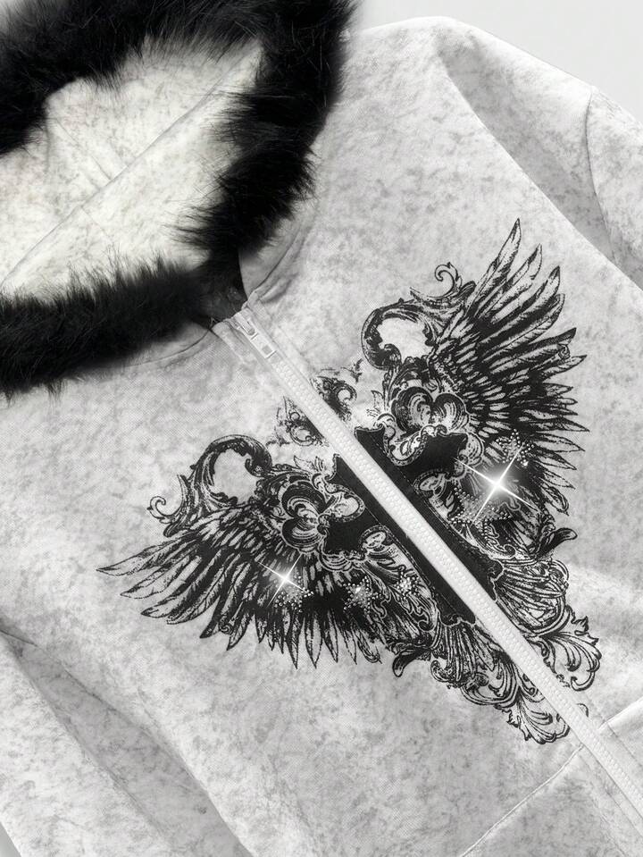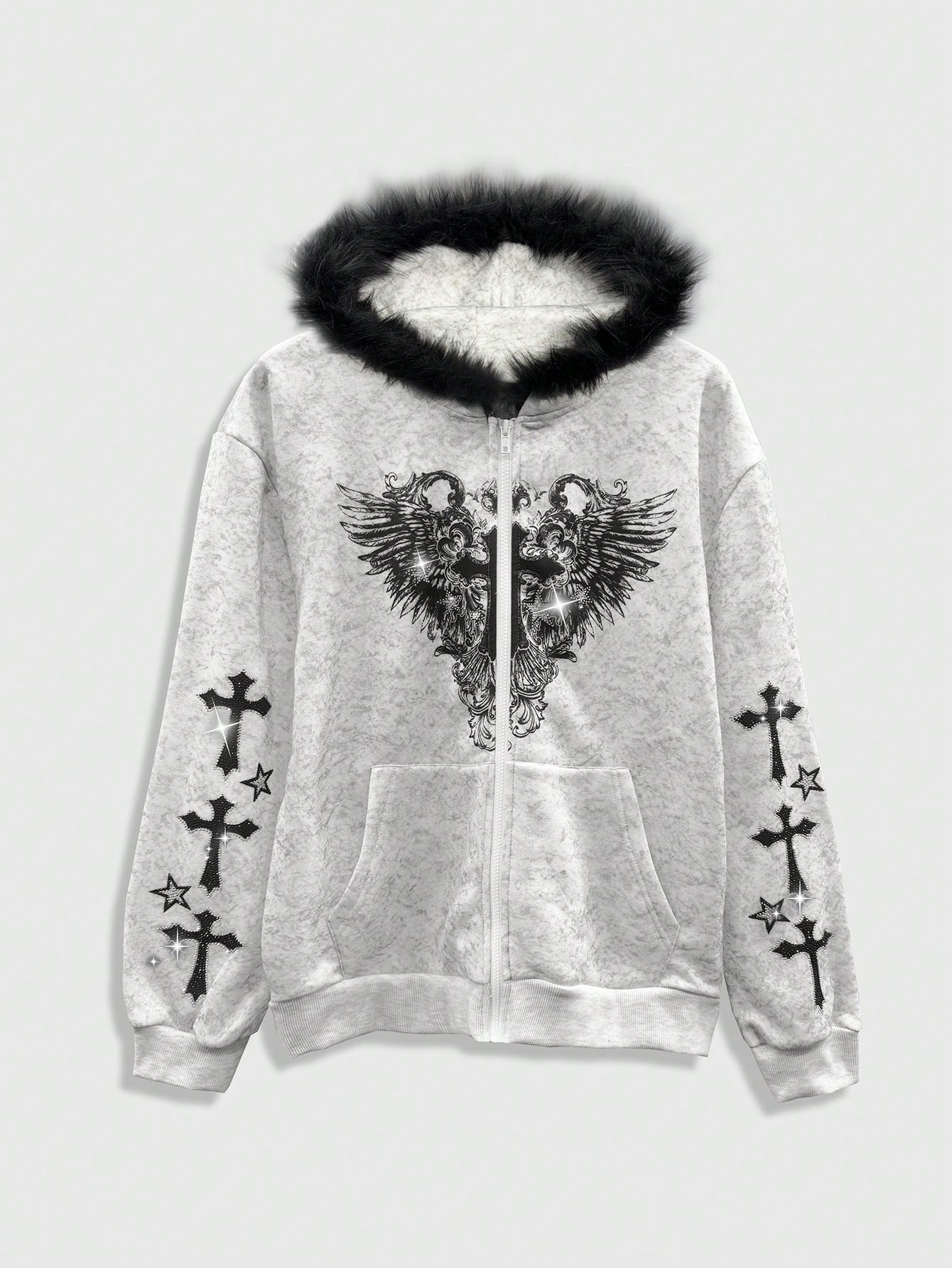Goth Men's Autumn/Winter Cross & Wing Graphic Zip-Up Hooded Fluffy Collar Casual Sweatshirt