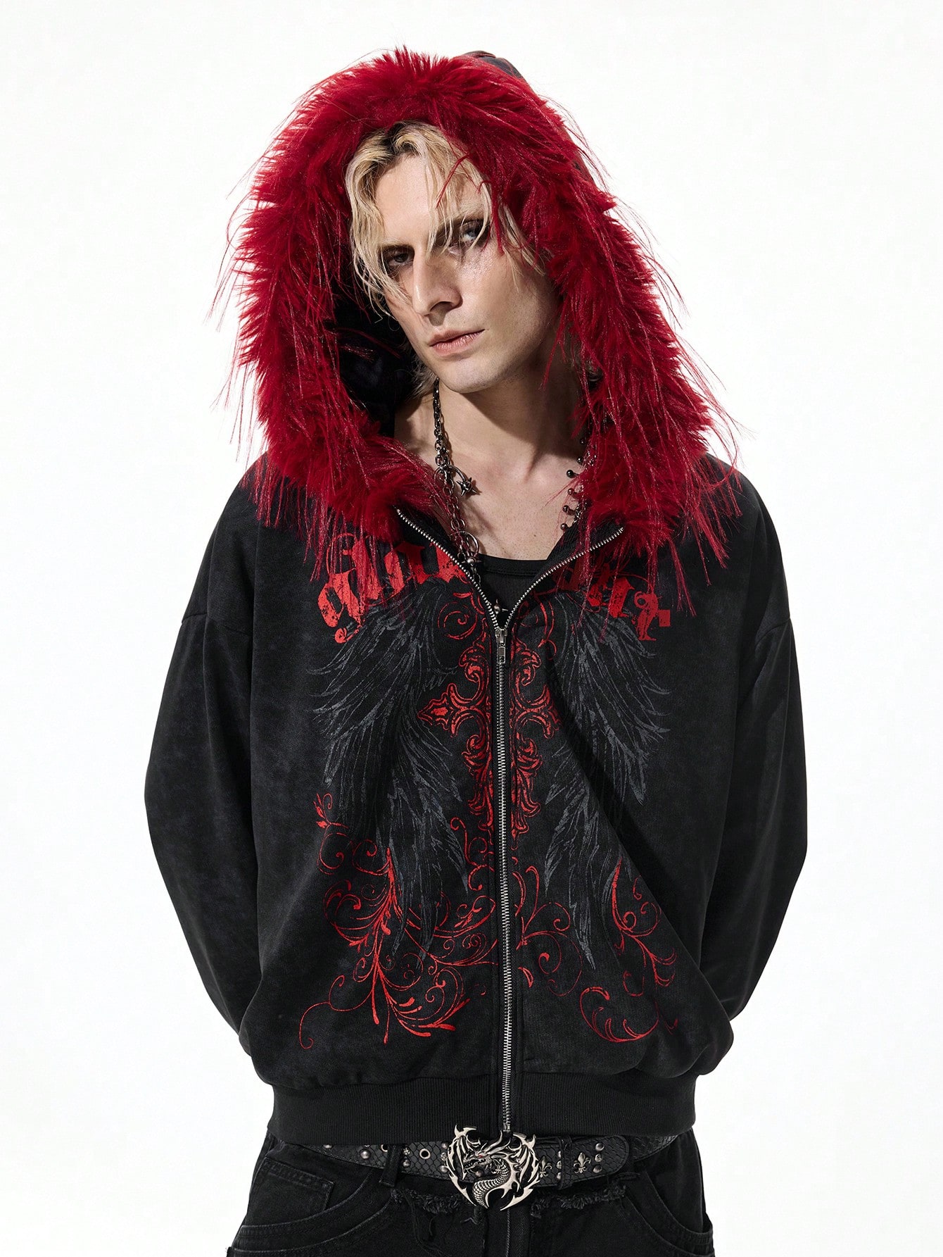 Goth Men's Casual Dark-Colored Fuzzy Trim Zip-Up Hoodie Sweatshirt, Autumn