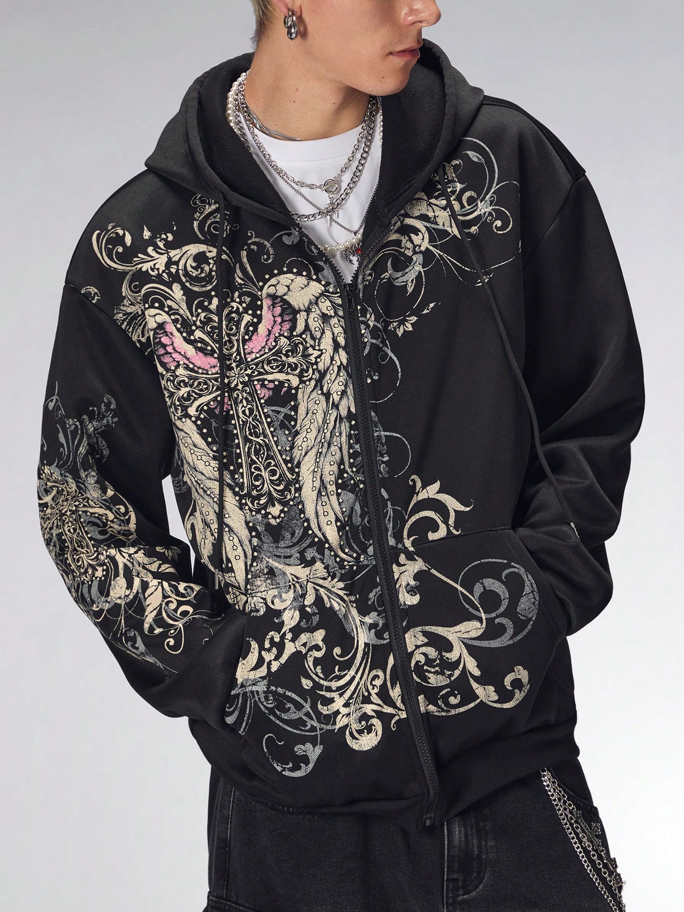 Goth Men's Cross And Wing Print Hooded Zip-Up Long Sleeve Sweatshirt