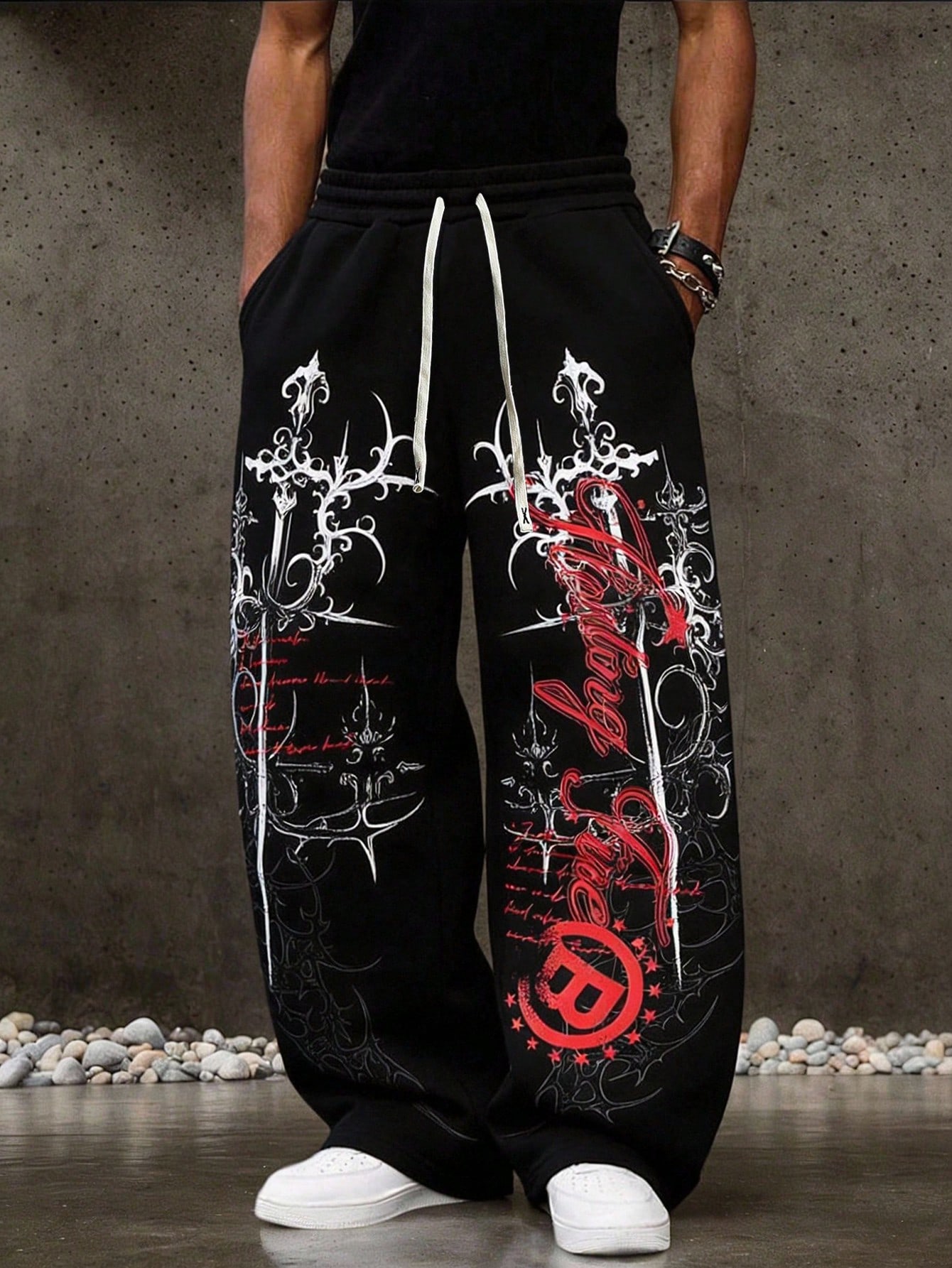 Goth Men's Cross Print Drawstring Waist Sweatpants