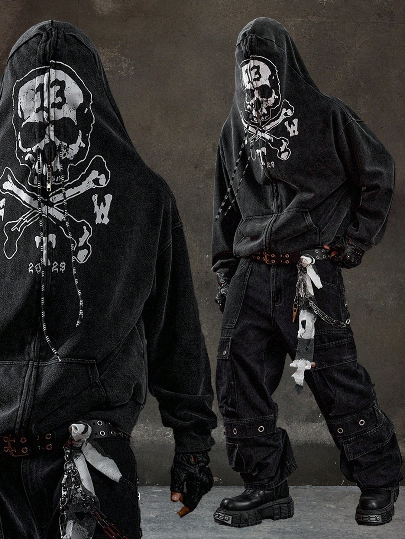 Goth Men's Dark Style Skull Print Zip-Up Hoodie Jacket, Fall