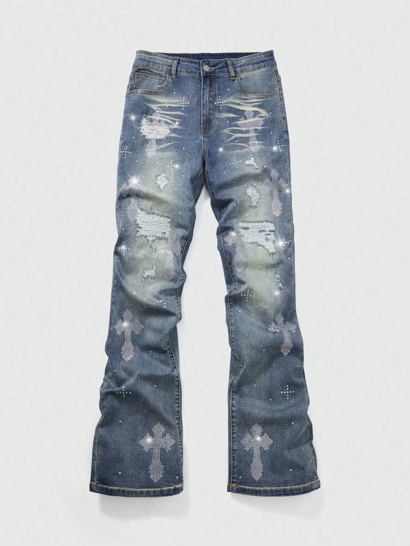 Goth Men's Fashion Casual Street Rhinestone Cross Ripped Flare Jeans