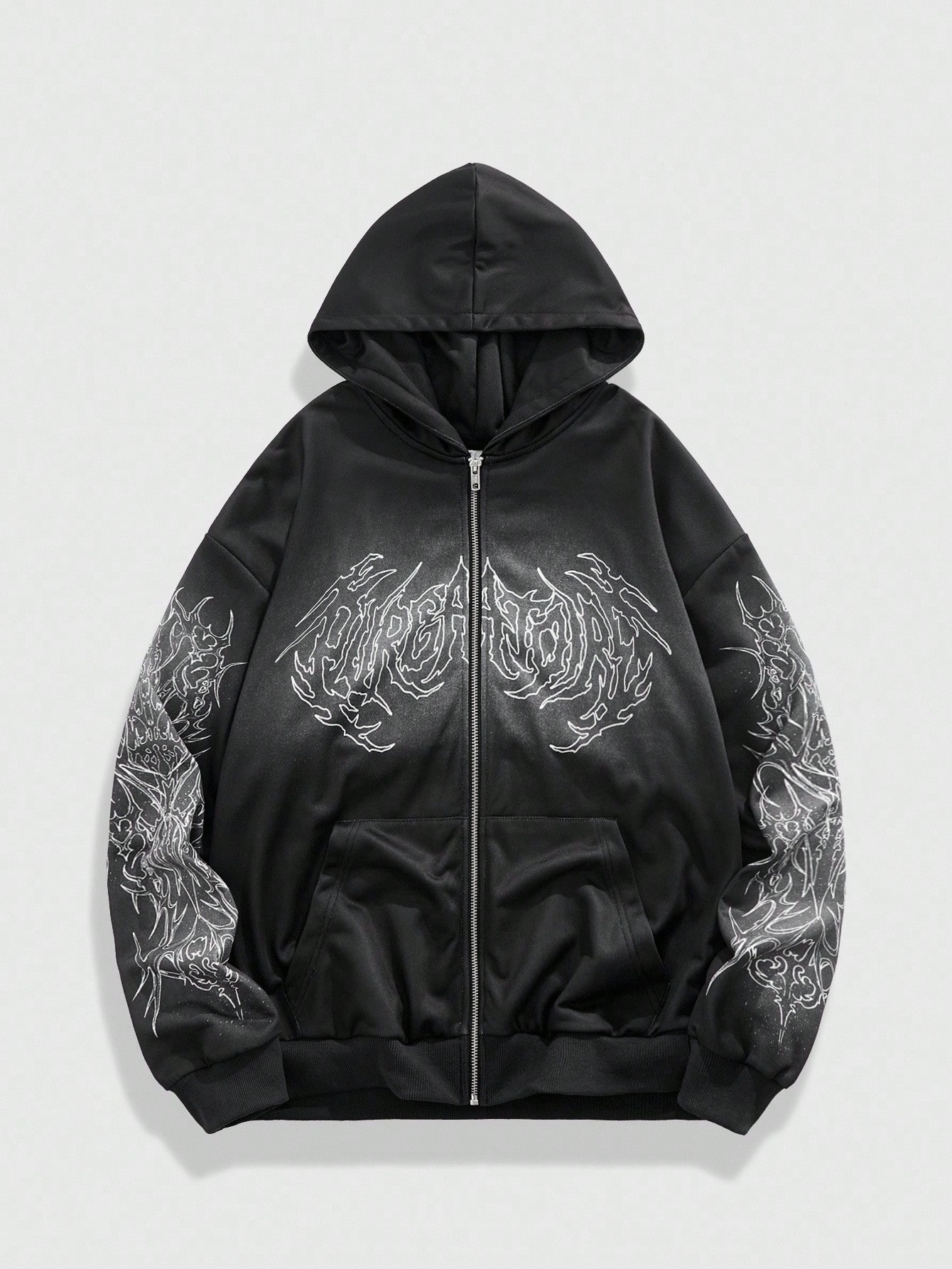 Goth Men's Fashion Contrast Color Dark Graphic Print Zip Up Hooded Sweatshirt Halloween, Fall