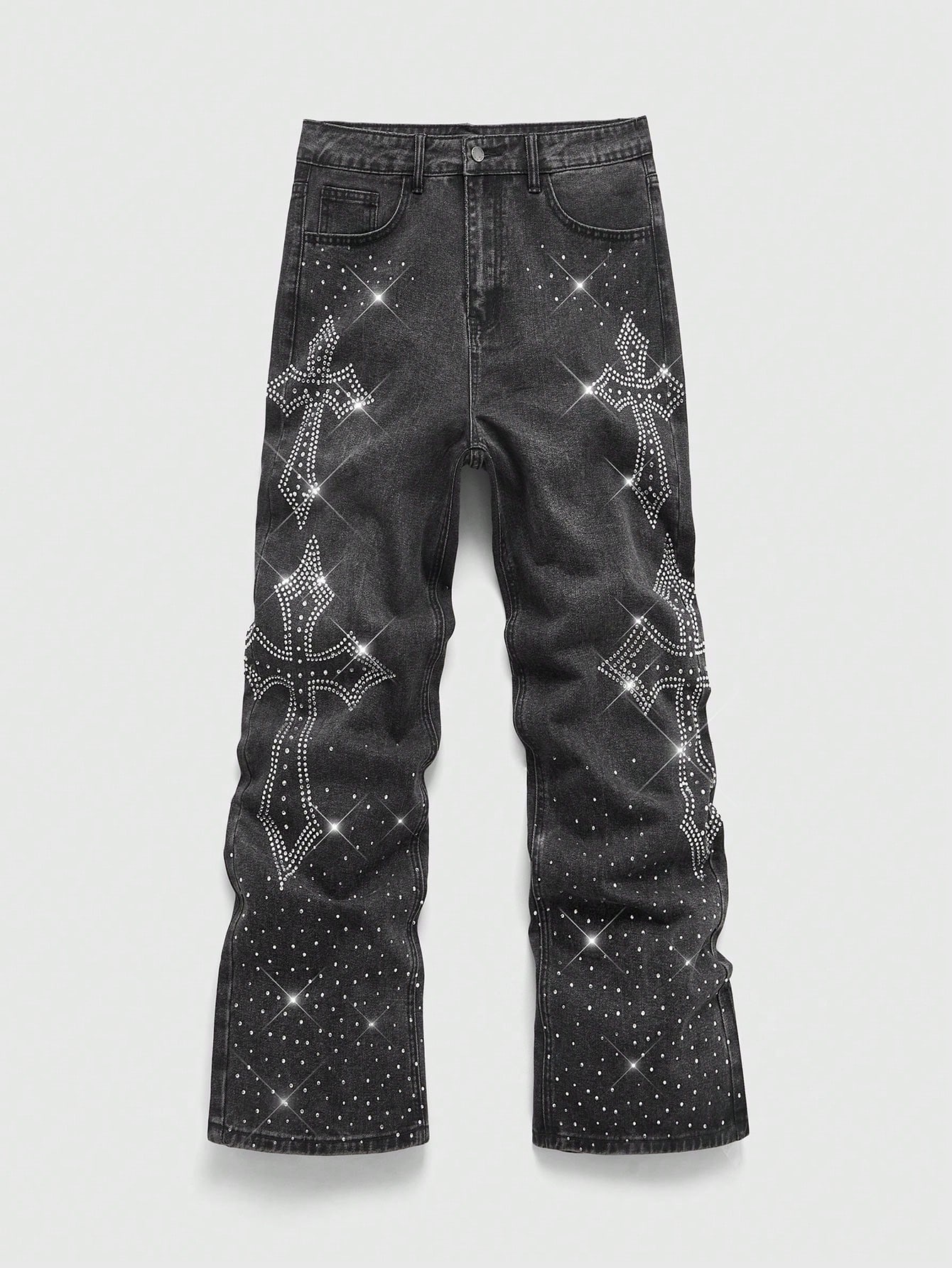 Goth Men's Loose Fit Casual Straight Leg Jeans With Cross Rhinestone Decor Pockets