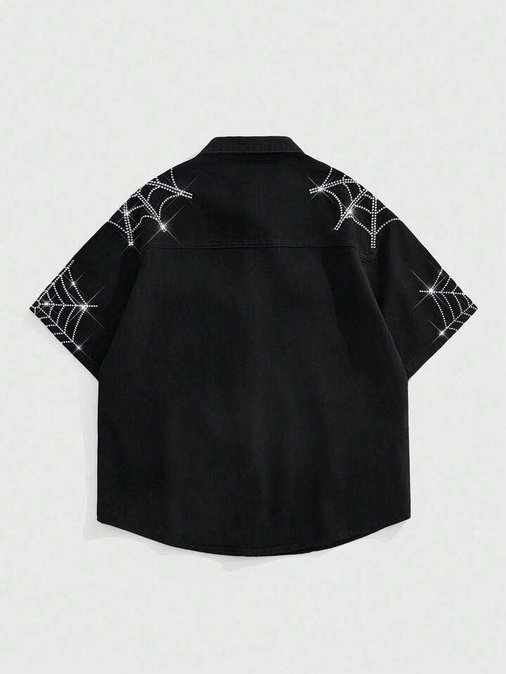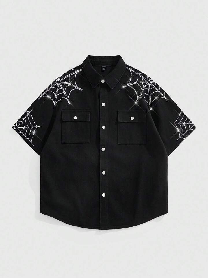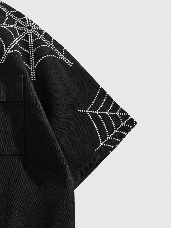 Goth Men's Spider Web Embroidered Short Sleeve Single-Breasted Casual Denim Shirt, Halloween