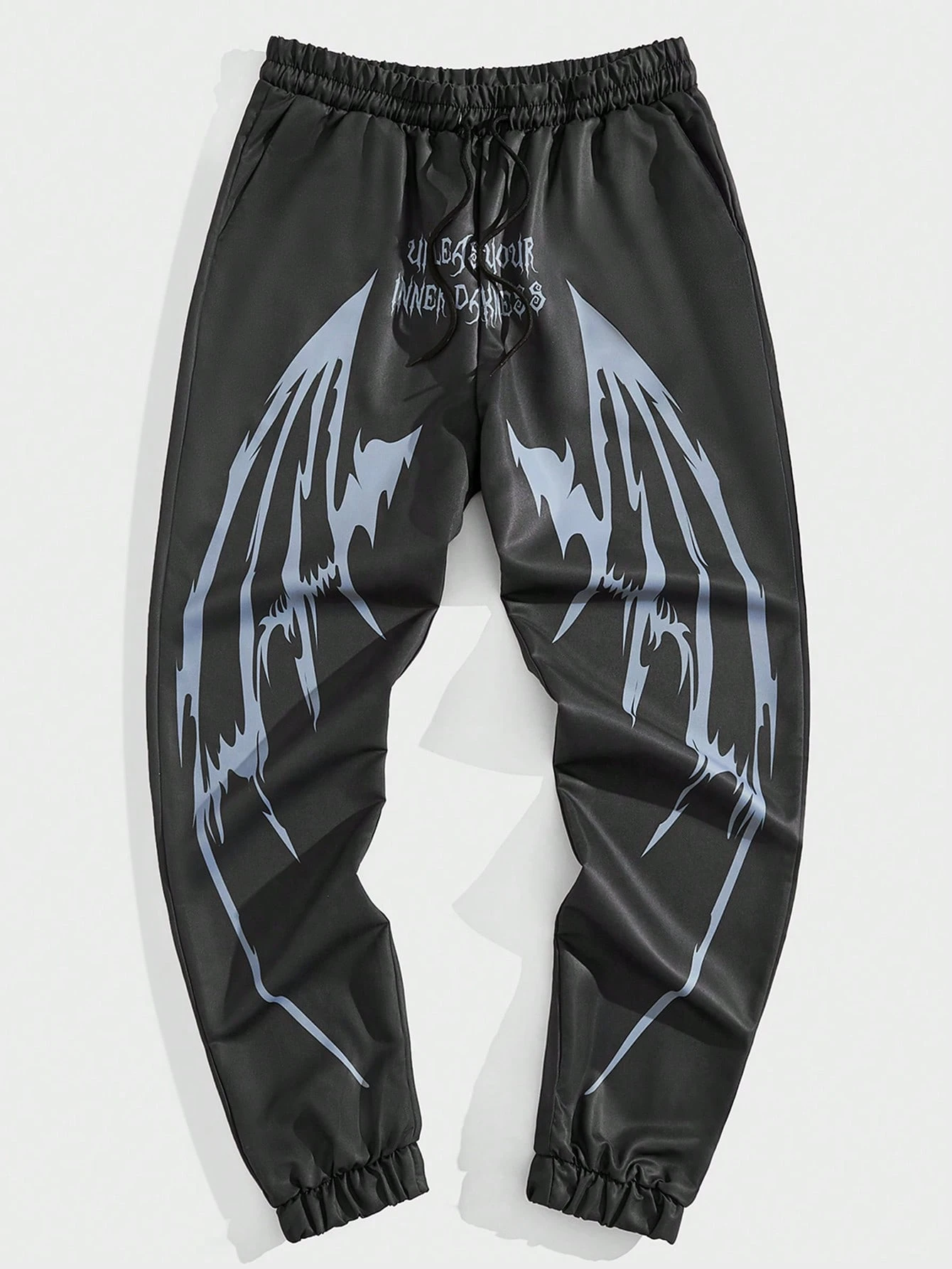 Goth Men's Words & Wing Print Drawstring Waist Pants