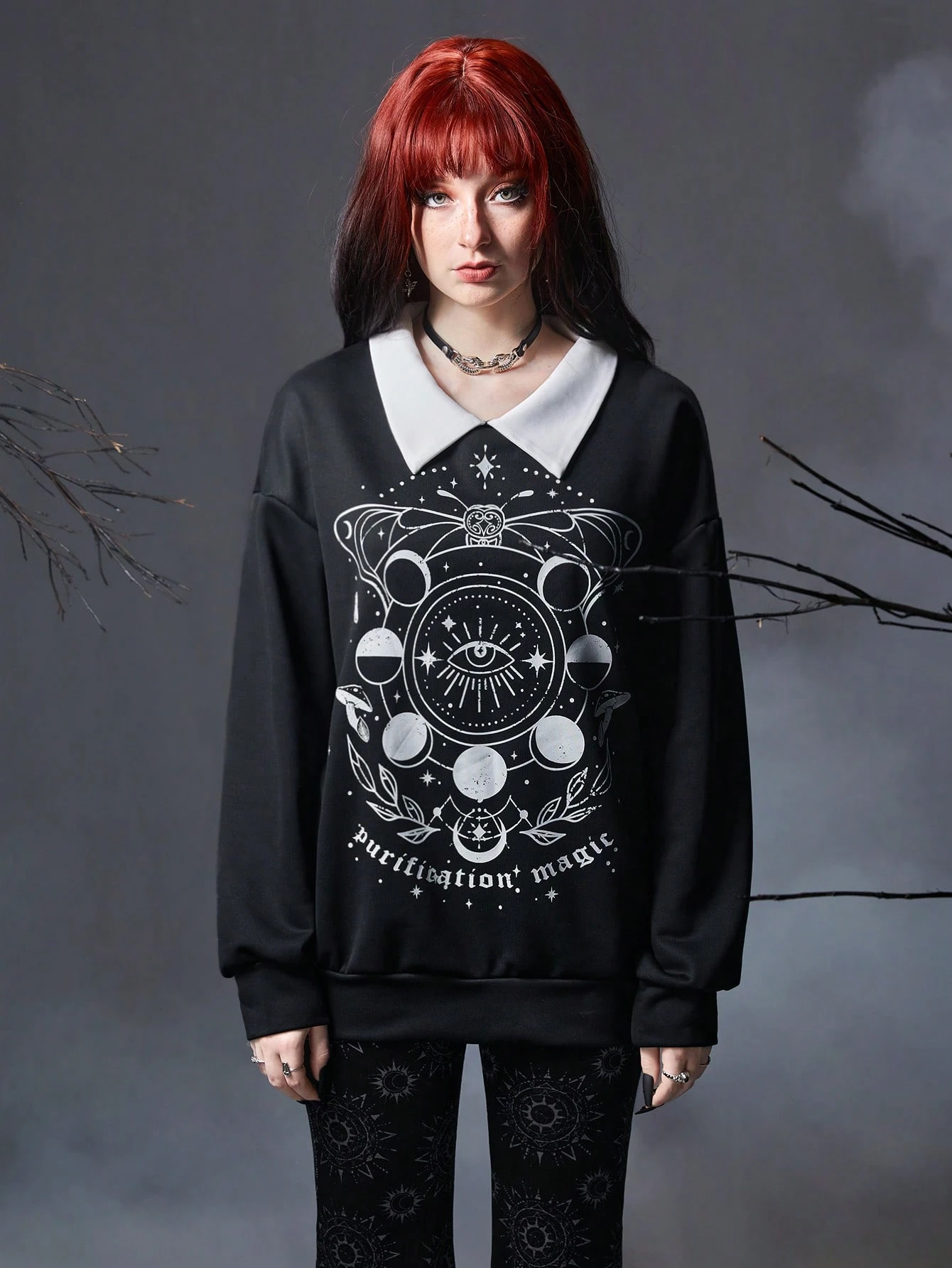 Goth Mushroom Print Contrast Collar Sweatshirt