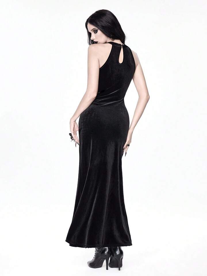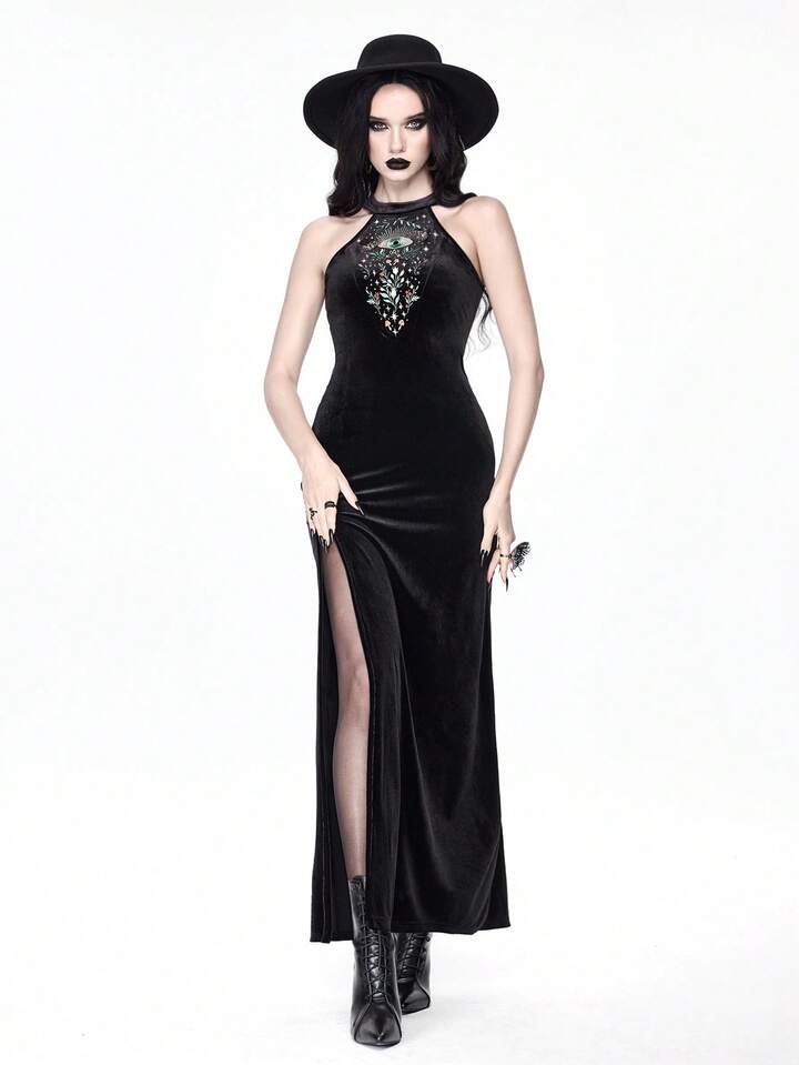 Goth Mysterious Botanical Embroidered Off-Shoulder High Slit Dress