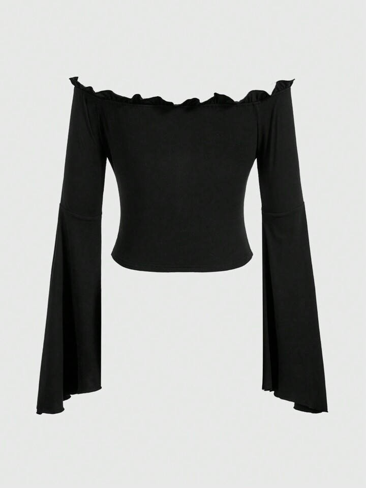 Goth Off Shoulder Floral Appliques Frill Trim Tee