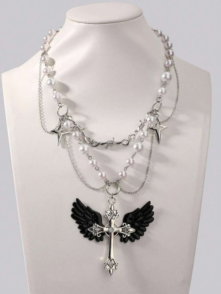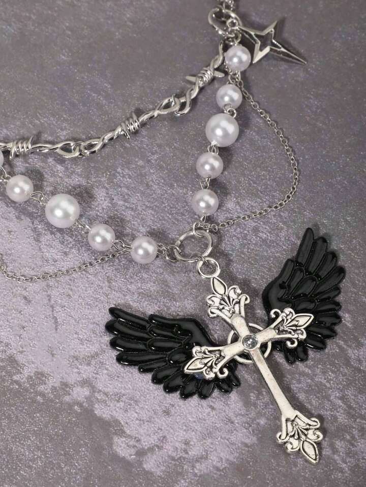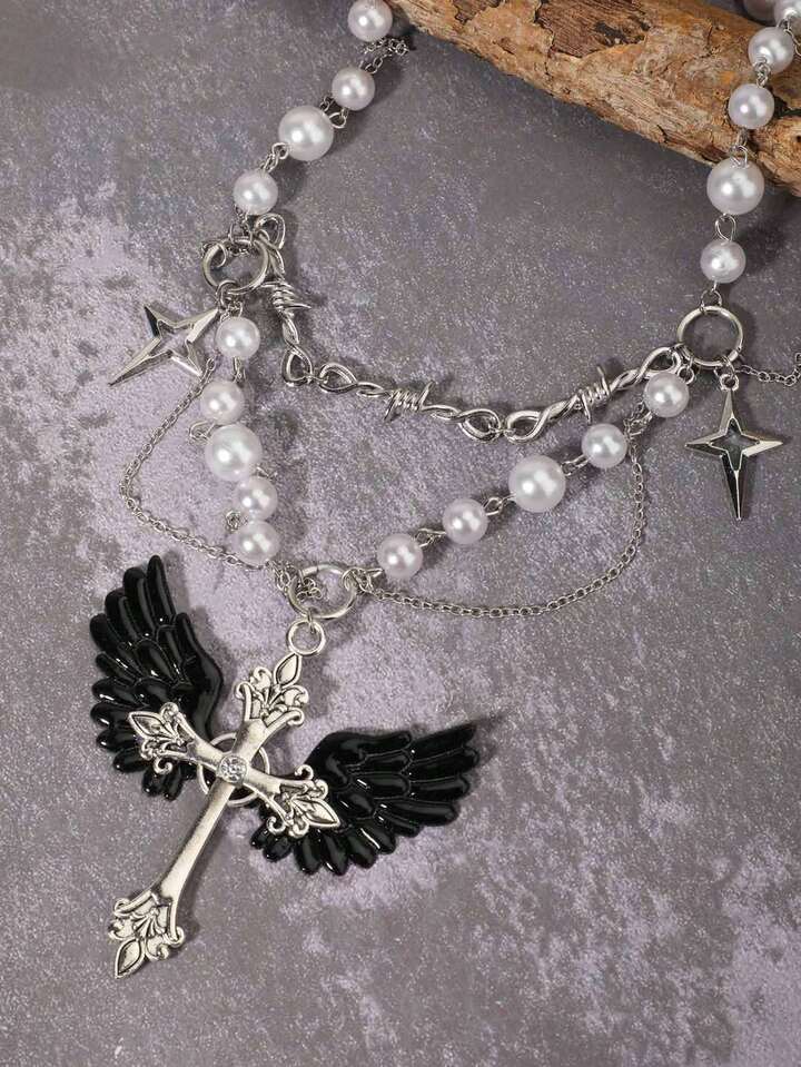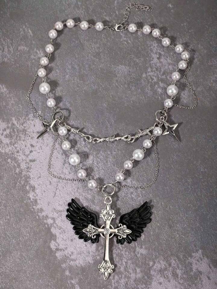 Goth Pearl Necklace With Creative Edgy Dark Style Cross Pendant Choker