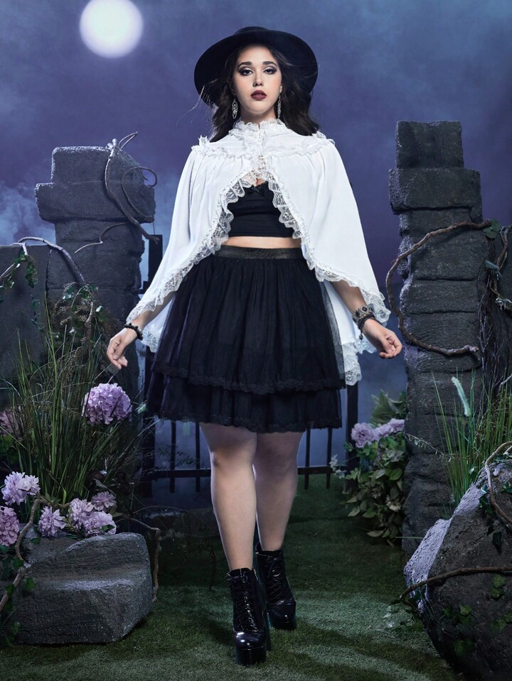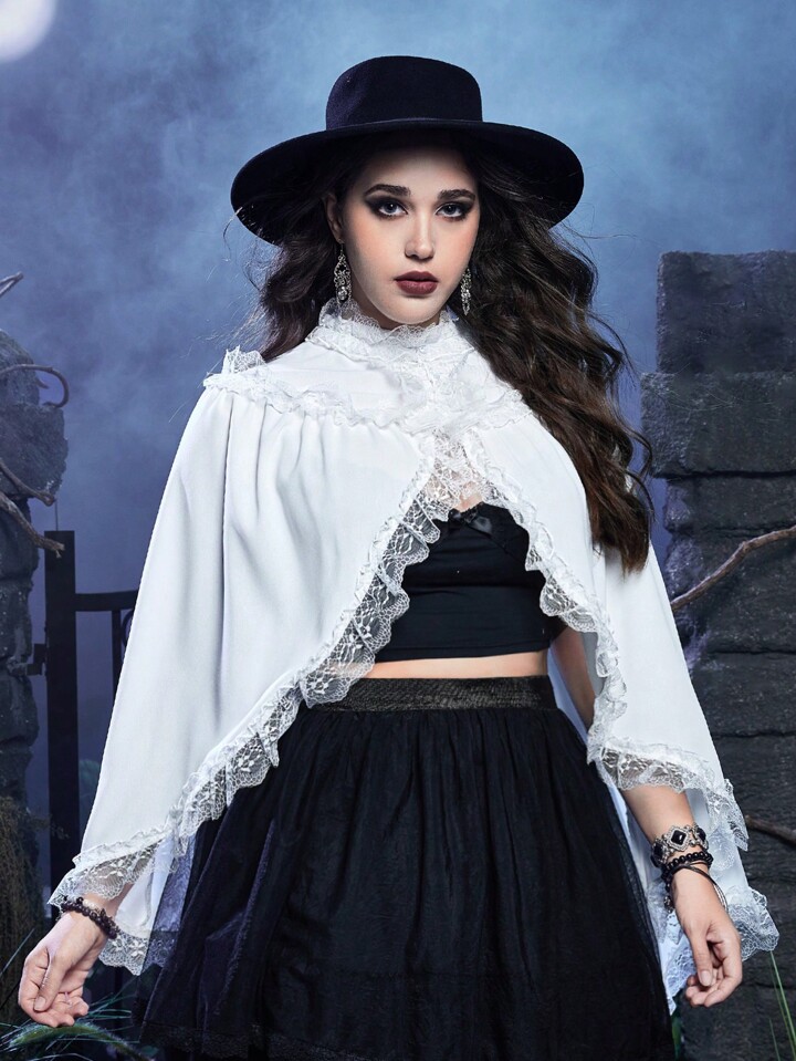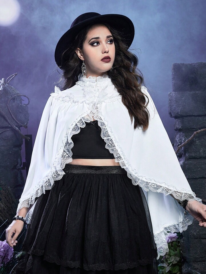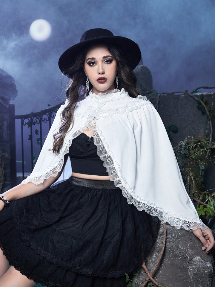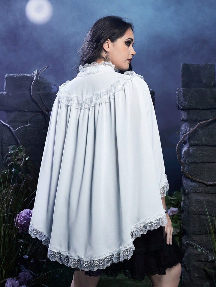 Goth Plus Contrast Lace Cloak Sleeve Open Front Cape Coat