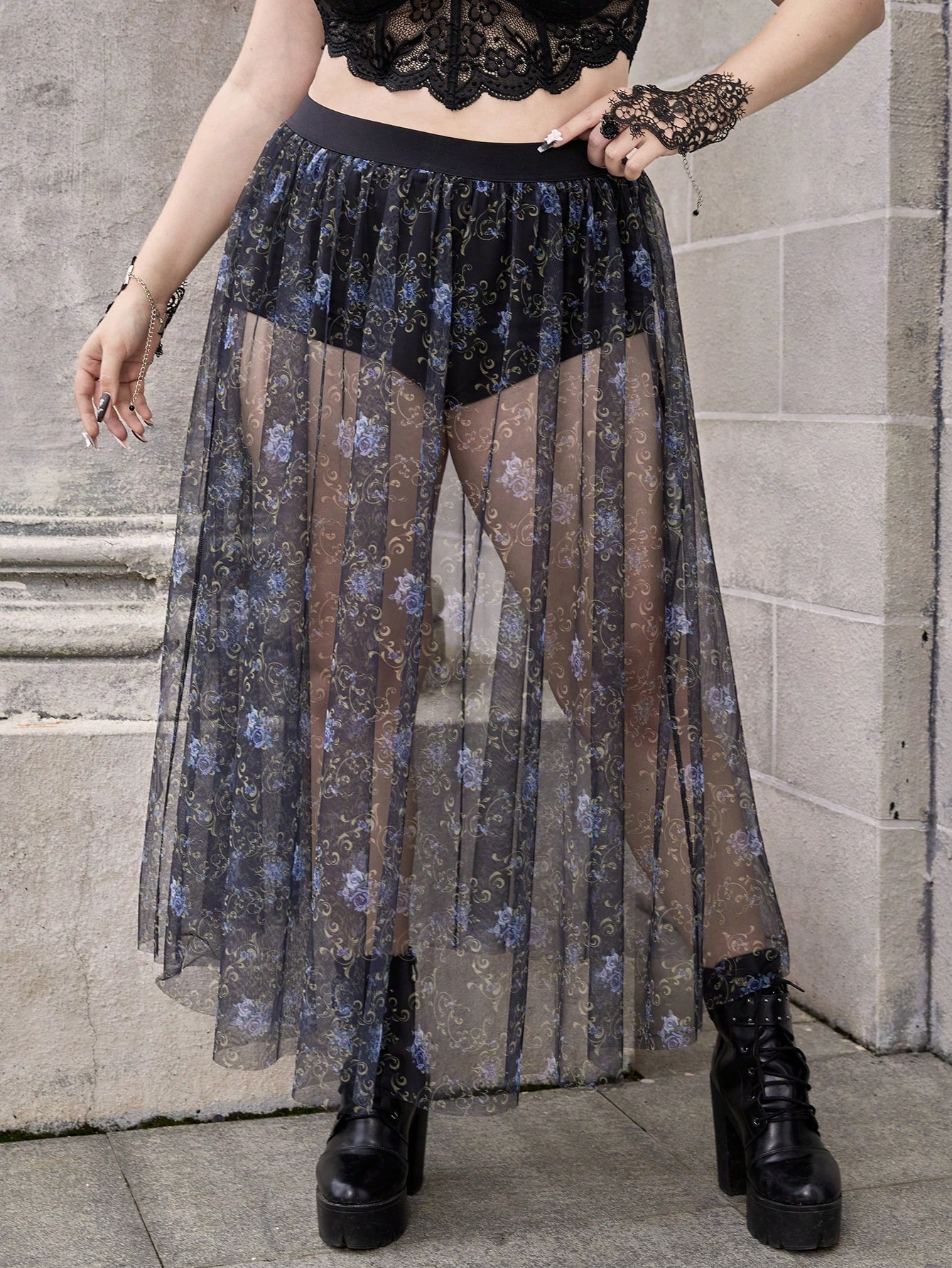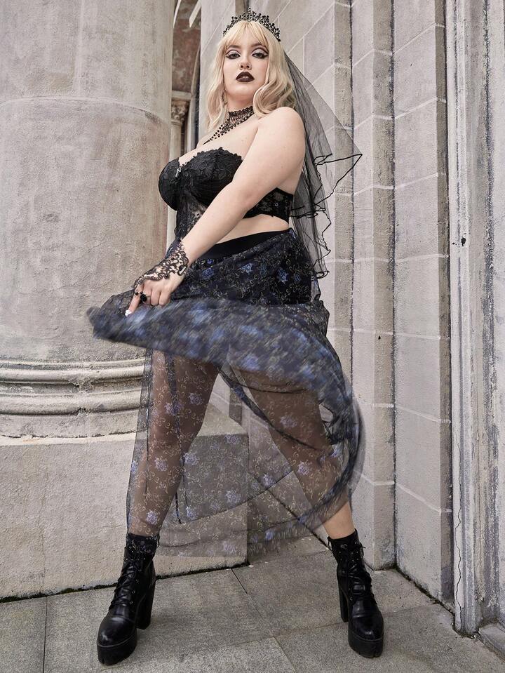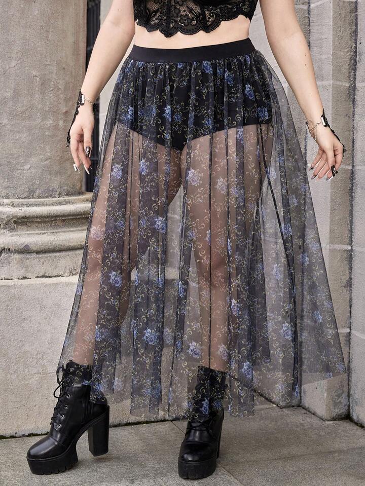 Goth Plus Floral Print Mesh Overlay Skirt