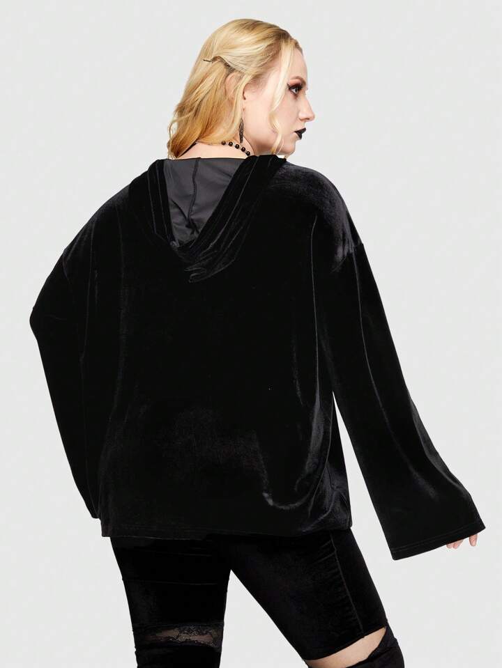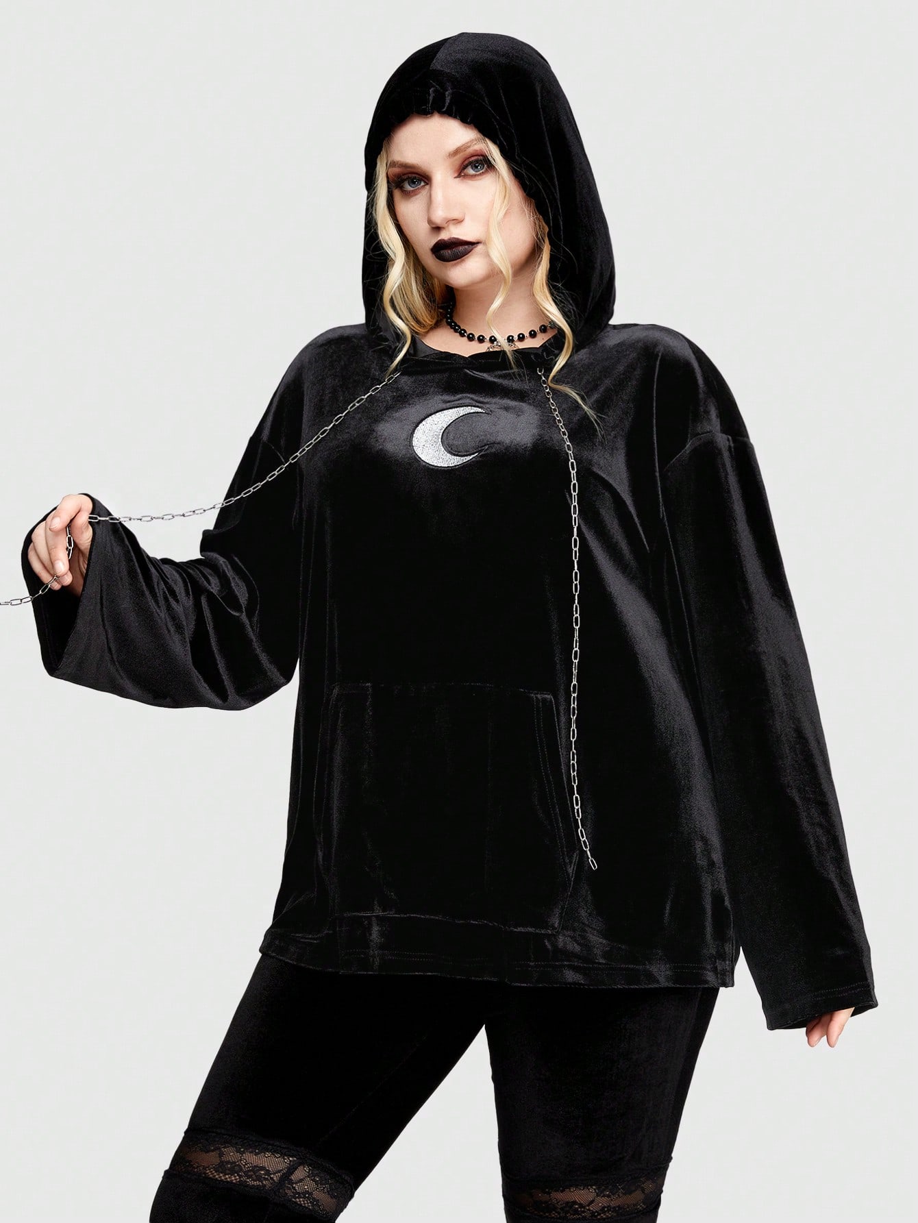 Goth Plus Moon Embroidered Drop Shoulder Chain Drawstring Velvet Hoodie