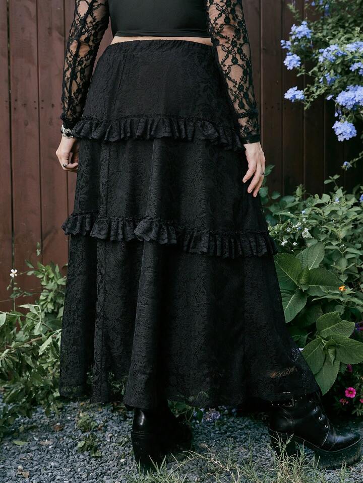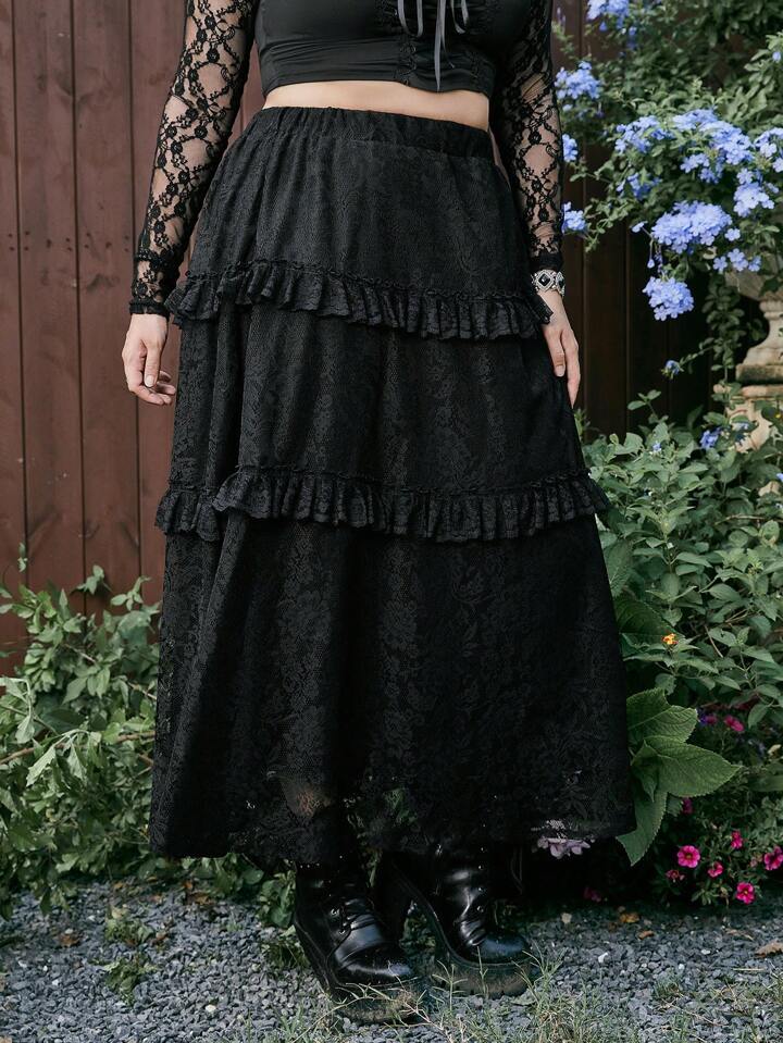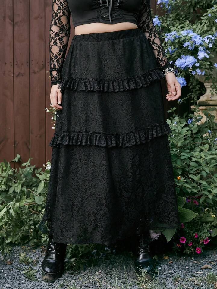 Goth Plus Ruffle Trim Lace Overlay Skirt