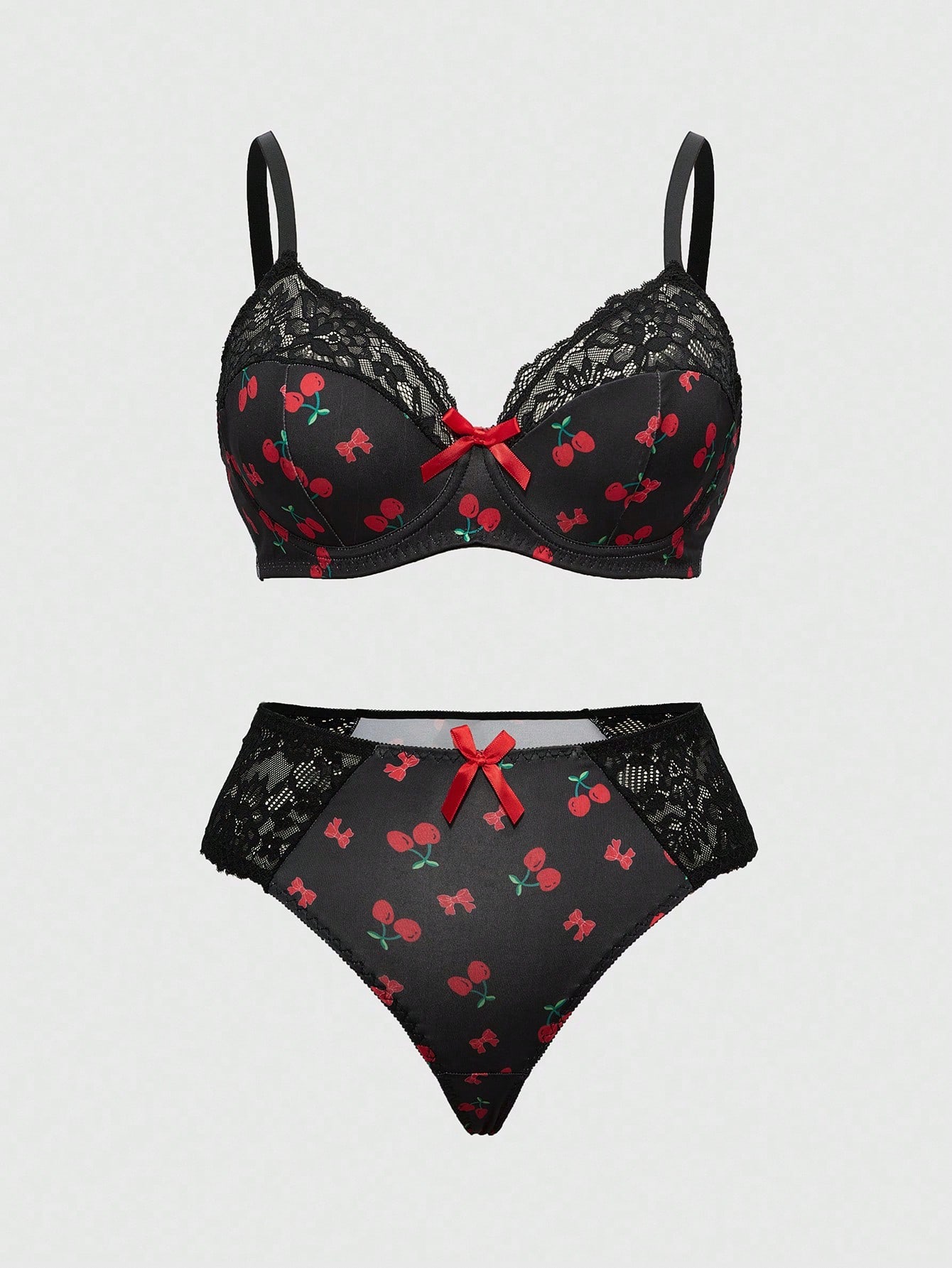 Goth Plus Size Cherry Bow Underwire Lace Sexy Bra And Panty Lingerie Set