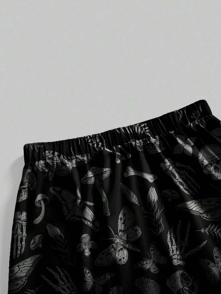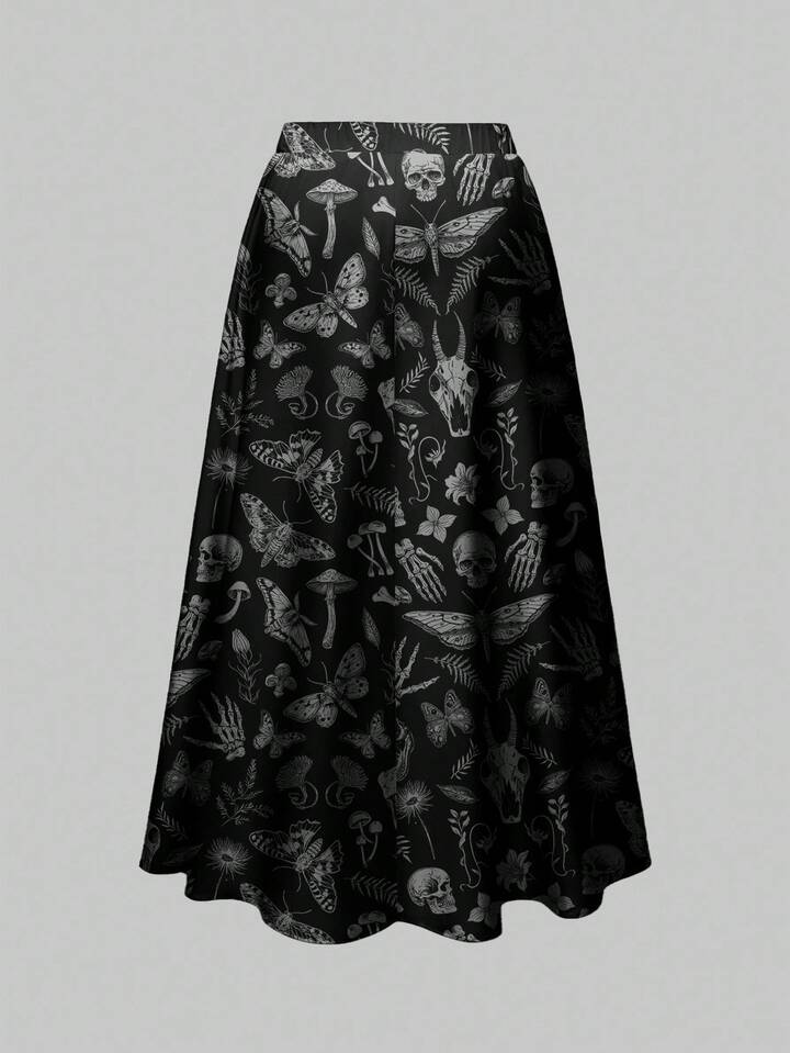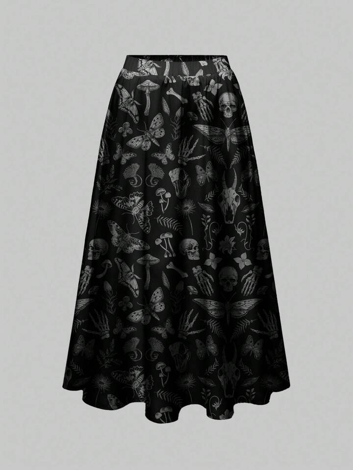 Goth Plus Size Dark Forest Halloween Skeleton, Moth, Bat Print Loose Fit Skirt