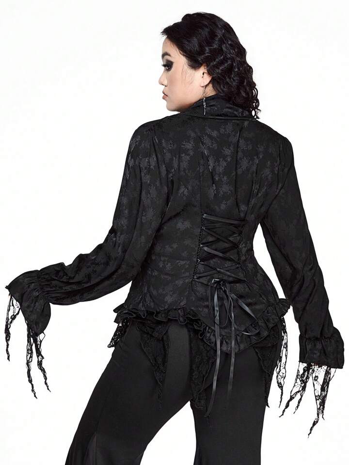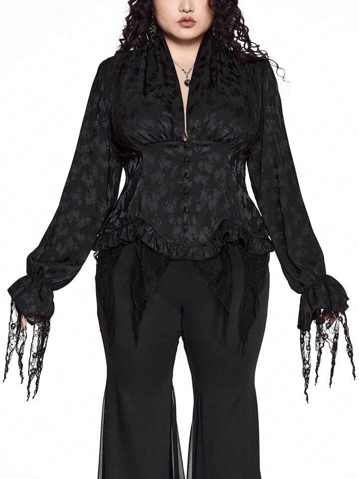 Plus Size Glamorous Vintage Gothic Jacquard Patchwork Asymmetrical Lace Blouse