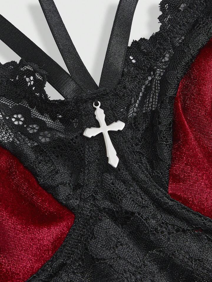 Plus Size Gothic Romantic Velvet & Lace Contrast Padded Bralette And Thong Set