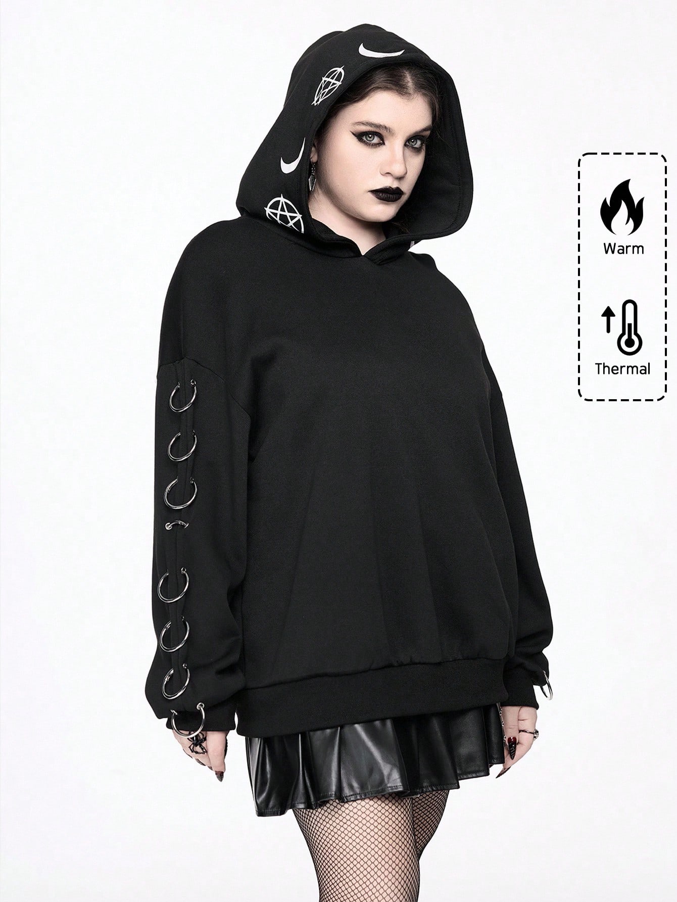 Plus Size Gothic Street Punk Style Star & Moon Pattern Metal Ring Decor Sleeve Sweatshirt, Autumn/Winter Plus Size Women Clothing Long Sleeve Top, Plus Size Women Pullover Hoodie