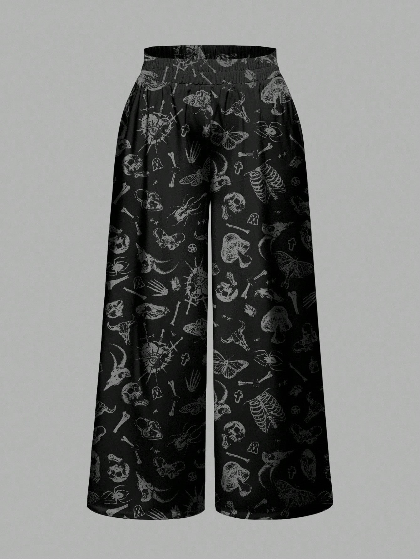 Goth Plus Size Loose Allover Print Wide Leg Pants, Halloween