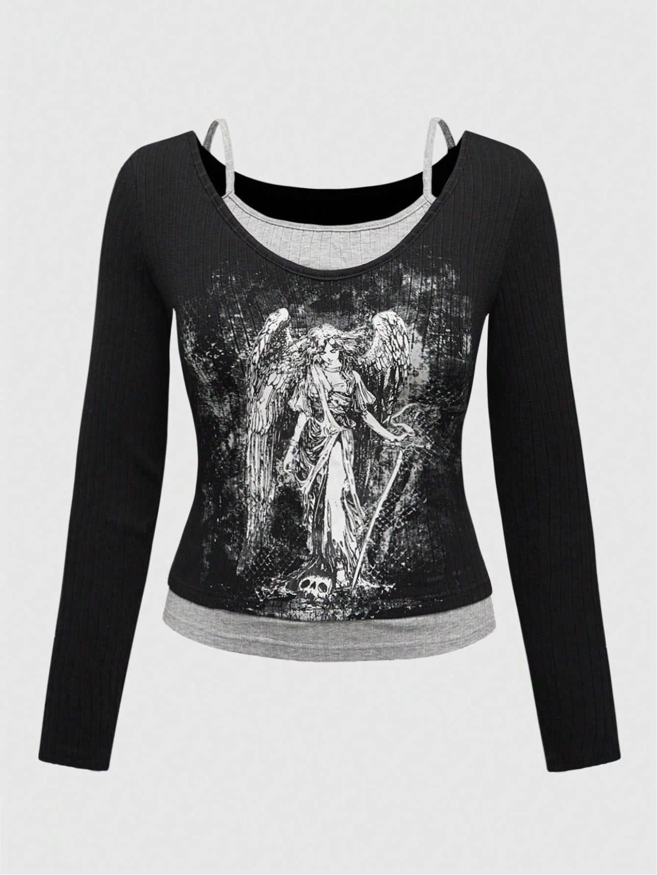 Goth Plus Size Retro Angel Wing Print 2 In 1 T-Shirt