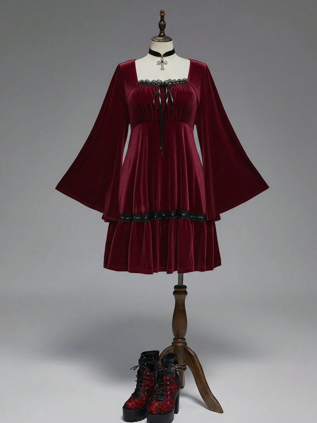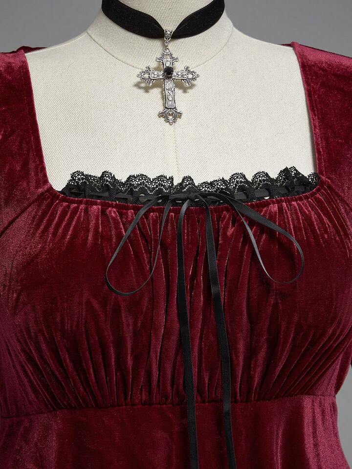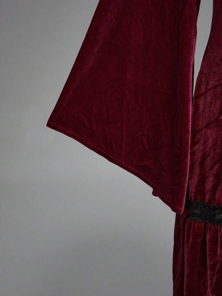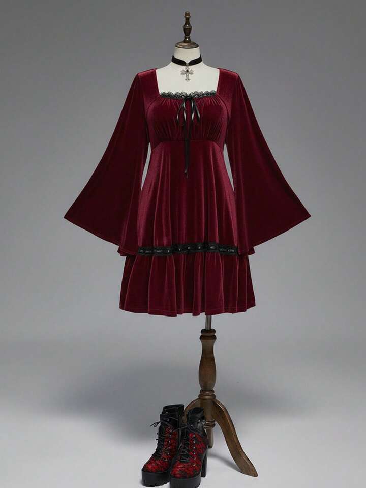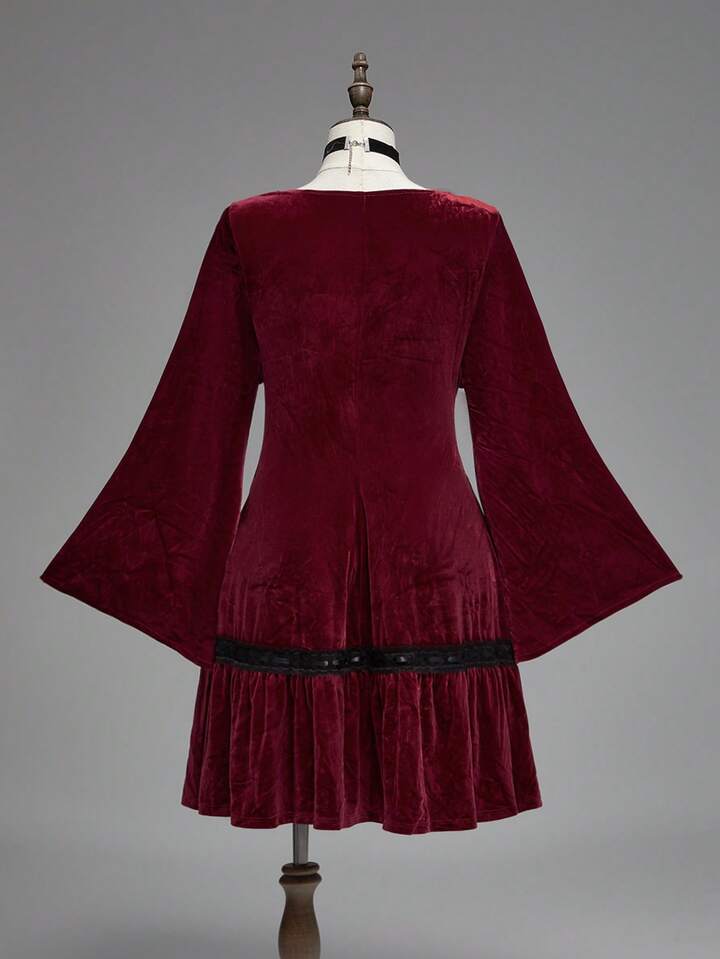 Goth Plus Size Vintage Romantic Dark Sweet Flare Sleeve Velvet Waist Dress, Birthday Dress/Christmas