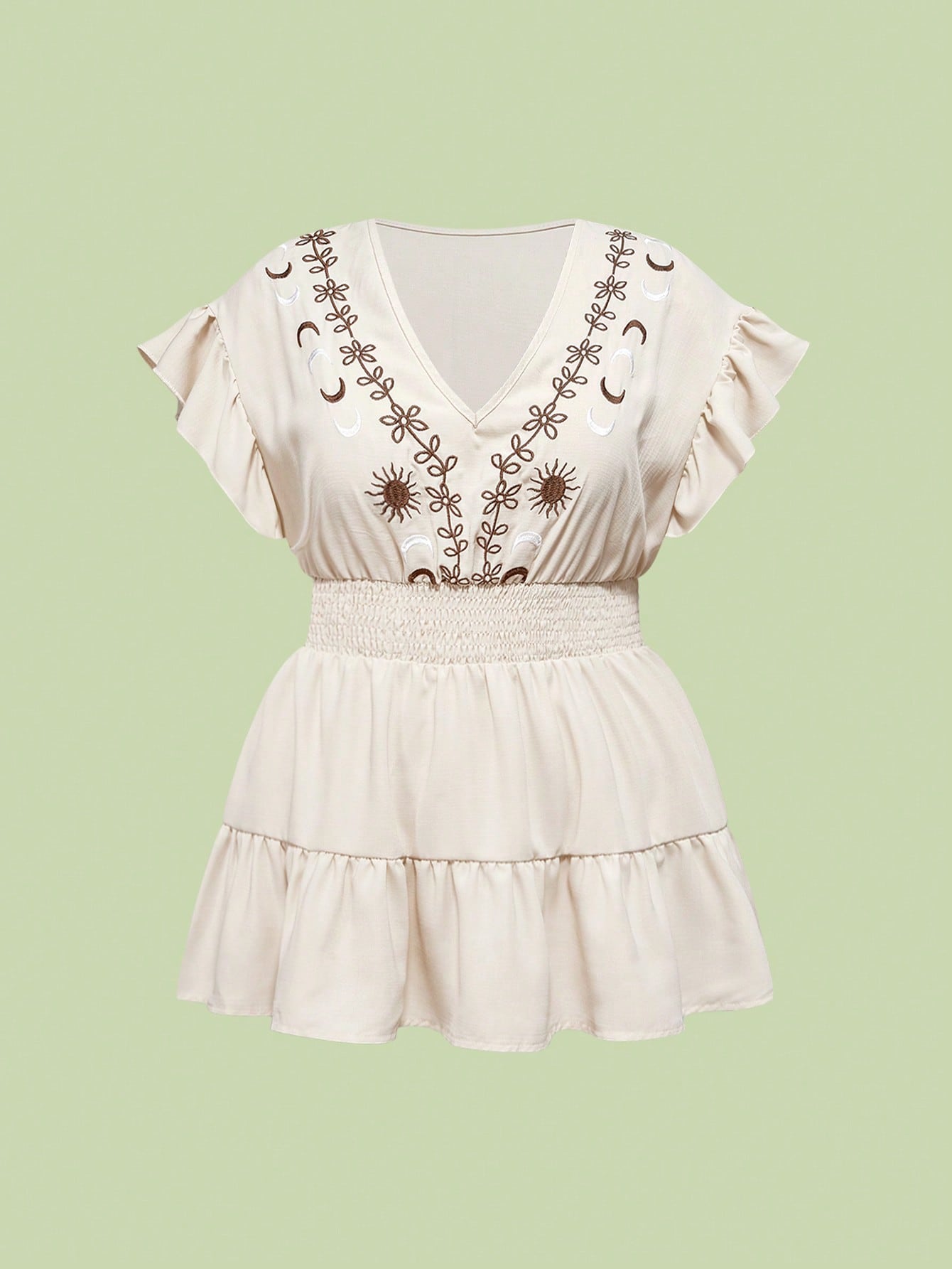 Goth Plus Size Women Boho Style Star & Vine Embroidered Fitted Waist Top, Summer