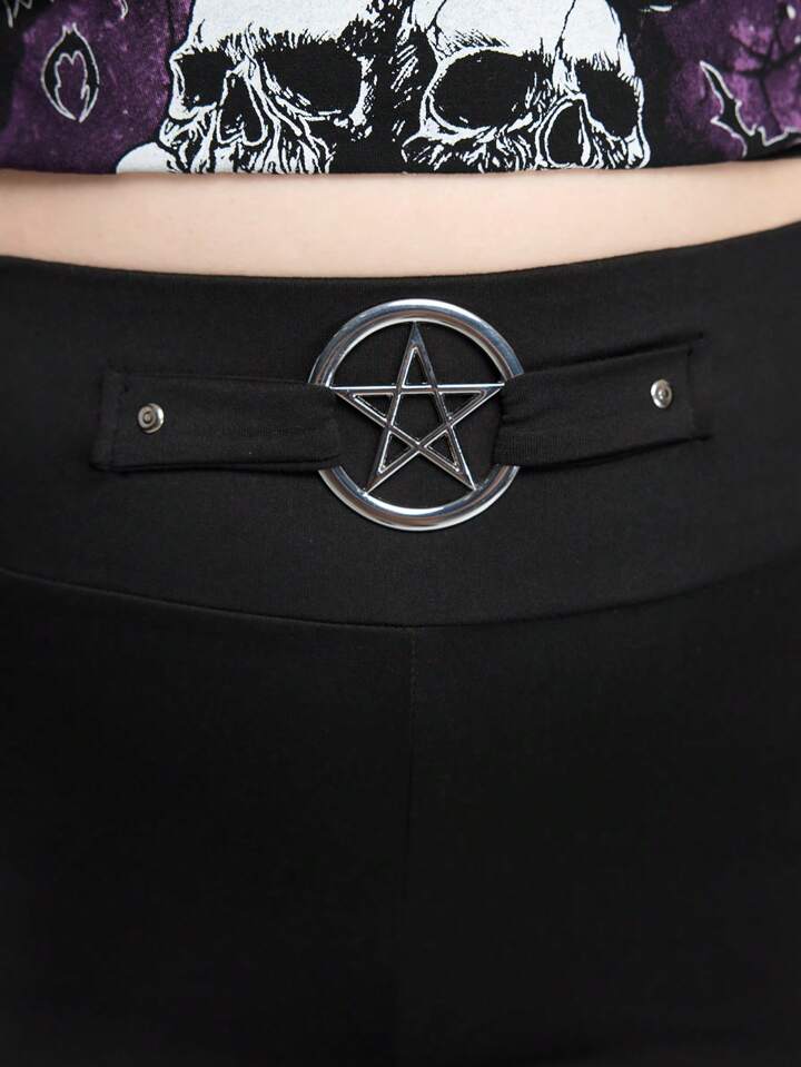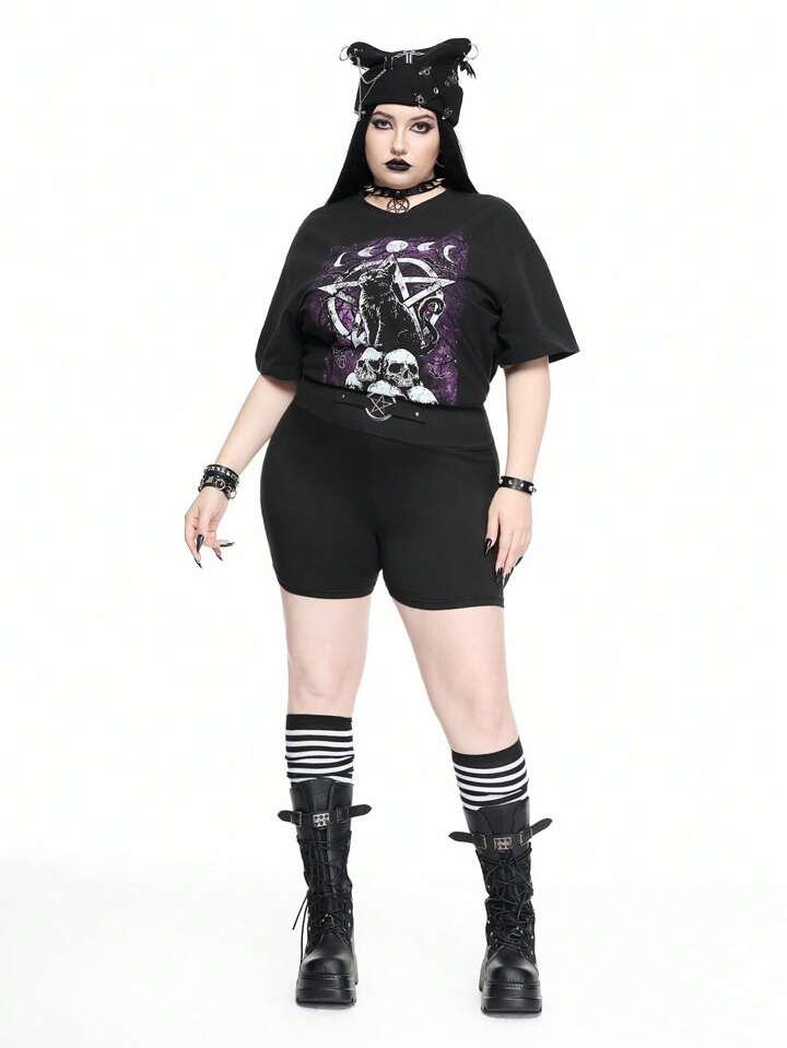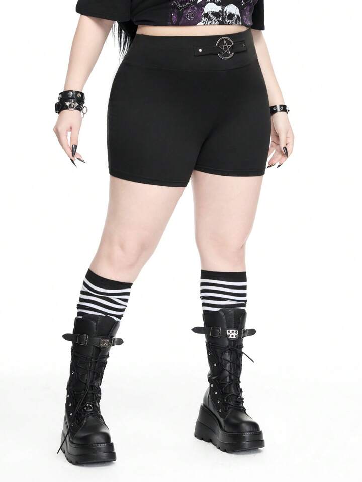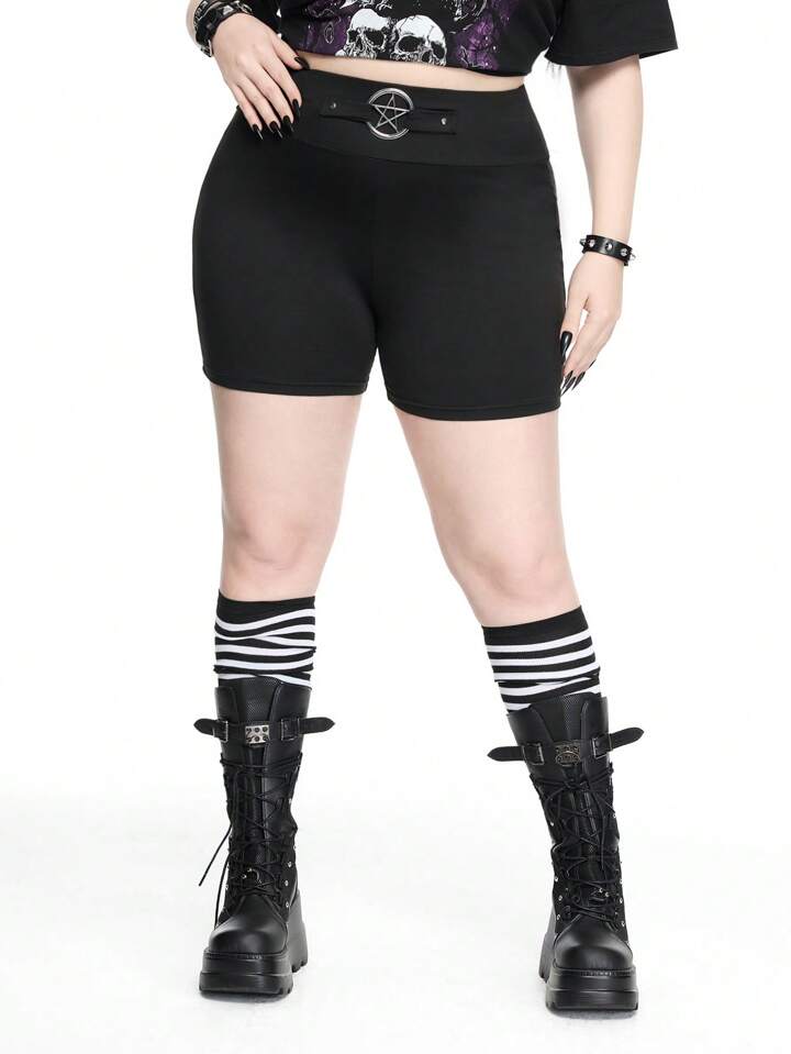 Goth Plus Size Women Punk Academy Metal Button Decor Skinny 3/4 Leggings Shorts
